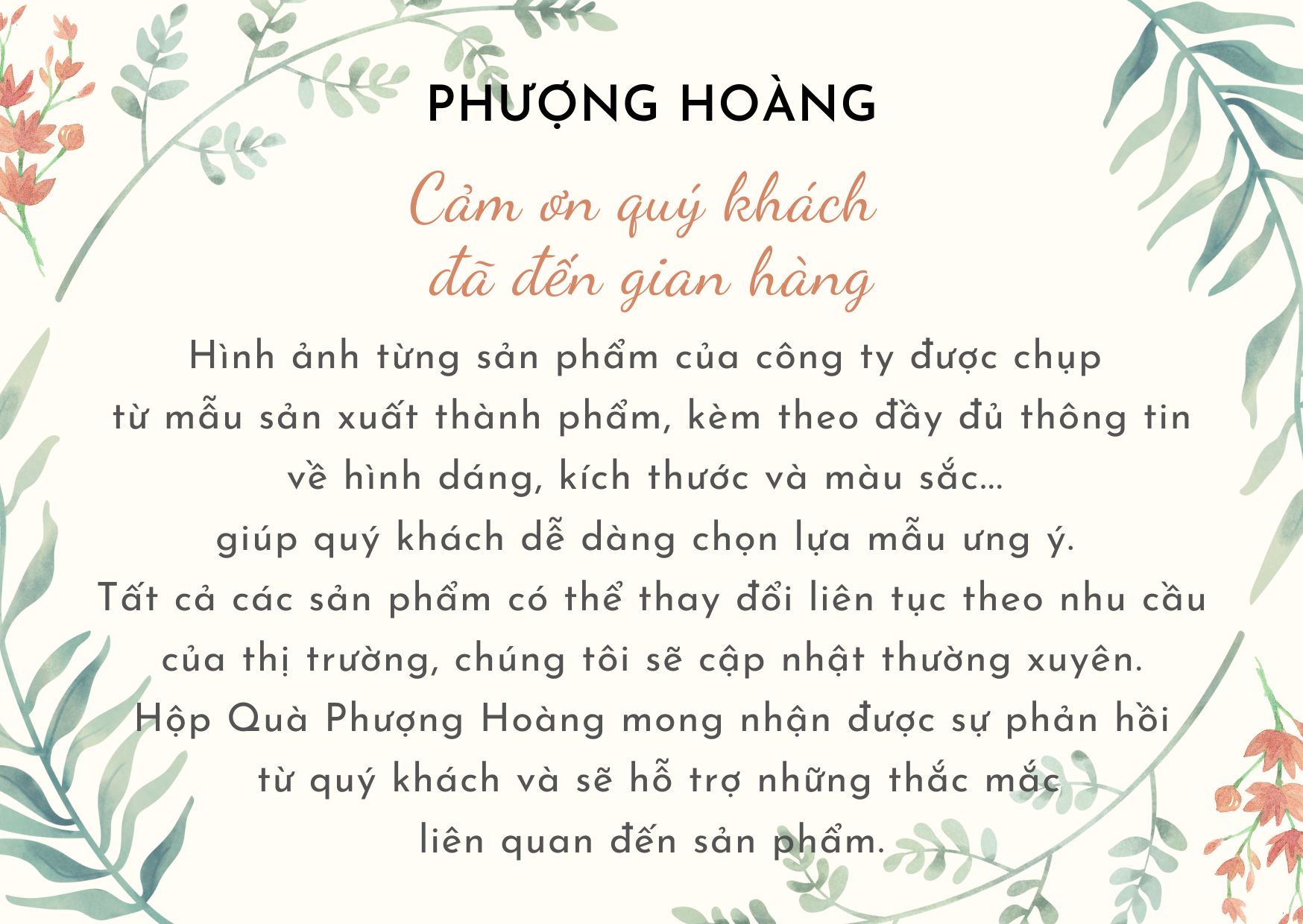 Hộp quà Phượng Hoàng được sản xuất dựa trên chất liệu giấy đa dạng như Ivory, Kraft, Mỹ thuật với nhiều kích thước từ nhỏ đến lớn và mẫu mã. Công ty Phượng Hoàng với