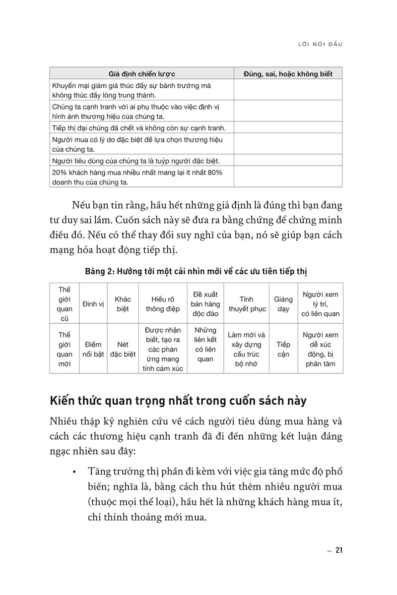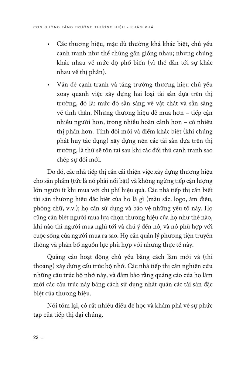 How Brands Grow - Con Đường Tăng Trưởng Thương Hiệu - Khám Phá Sự thật đằng sau các chương trình quảng cáo, khuyến mãi và khách hàng thân thiết Nội dung cuốn sách: Cuốn sách đưa ra câu trả lời xác đáng cho những vấn đề muôn thuở của lĩnh vực tiếp thị như: Làm thế nào để phát triển một thương hiệu? Làm sao để quảng cáo một cách hiệu quả? Áp dụng các chương trình giảm giá có thực sự có tác dụng? Đây là cuốn sách đầu tiên trình bày các quy luật tiếp thị trong bối cảnh cụ thể, đồng thời khám phá ý nghĩa cũng như ứng dụng của chúng. Với những nghiên cứu được thực hiện trong hàng thập kỷ, cuốn sách là một cẩm nang hoàn hảo được viết cho các chuyên gia tiếp thị nhằm phát triển thương hiệu của họ. Cuốn sách đưa ra những khái niệm mới và thách thức những quan điểm truyền thống về tiếp thị và xây dựng thương hiệu. Tác giả khẳng định rằng nhiều nhà tiếp thị đã hiểu sai về cách thức mà khách hàng tìm kiếm, chọn lựa và mua sản phẩm. Ông cho rằng việc tập trung quá nhiều vào các chiến lược quảng cáo, khuyến mãi, tăng đội ngũ khách hàng trung thành, và tối ưu hóa chiến lược sản phẩm, đôi khi không đạt hiệu quả cao trong việc xây dựng thương hiệu và tăng trưởng doanh số. Cuốn sách này có gì đặc biệt? Cuốn sách có giá trị vì nó đem đến những thông tin quan trọng và những quan điểm mới mẻ về cách tiếp cận khách hàng và xây dựng thương hiệu, giúp độc giả có thể hiểu rõ hơn về những yếu tố quan trọng trong việc tăng trưởng doanh số và duy trì thương hiệu mạnh mẽ. Tác giả Byron Sharp đã phân tích và đánh giá các chiến lược tiếp thị và xây dựng thương hiệu một cách khoa học và dựa trên nghiên cứu thực tế, đưa ra những quan điểm mới và thách thức những quan điểm truyền thống trong ngành tiếp thị. Ông nhấn mạnh rằng việc hiểu rõ khách hàng và tập trung vào các yếu tố quan trọng như việc tăng cường nhận thức thương hiệu, tăng cường sự xuất hiện của thương hiệu trên thị trường và khả năng tiếp cận được nhiều khách hàng hơn, là cách hiệu quả để tăng trưởng doanh số và xây dựng thương hiệu mạnh mẽ. Cuốn sách này cũng đưa ra những lời khuyên cụ thể và những ví dụ thực tế để giải quyết những vấn đề và thách thức mà các nhà tiếp thị đang gặp phải trong việc xây dựng thương hiệu và tăng trưởng doanh số. Nó cung cấp cho độc giả một cách nhìn mới về thị trường và khách hàng, giúp họ đưa ra các quyết định chiến lược tiếp thị và xây dựng thương hiệu dựa trên những nghiên cứu khoa học và thực tế. Vì vậy, đọc cuốn sách này sẽ giúp độc giả hiểu rõ hơn về cách thức mà khách hàng tìm kiếm, chọn lựa và mua sản phẩm, từ đó giúp các nhà tiếp thị có thể tối ưu hóa chiến lược của mình và đạt được hiệu quả cao hơn trong việc tăng trưởng doanh số và xây dựng thương hiệu mạnh mẽ. Cuốn sách không chỉ đem đến cho độc giả những giá trị mong đợi như các chiến lược tiếp thị và xây dựng thương hiệu, mà còn cung cấp cho độc giả những giá trị gia tăng khác như: