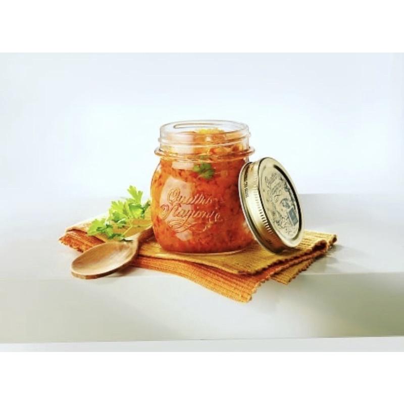 Nắp đậy màu vàng đồng nổi bật có in logo thiết kế dạng xoay giúp đậy kín và cách ly thực phẩm khỏi bụi bẩn. Phần thân hũ cách điệu với logo Quattro Stagioni in nổi vừa đẹp mắt vừa có công dụng chống trơn trượt và làm nổi bật sự tinh tế của chất liệu thủy tinh.
