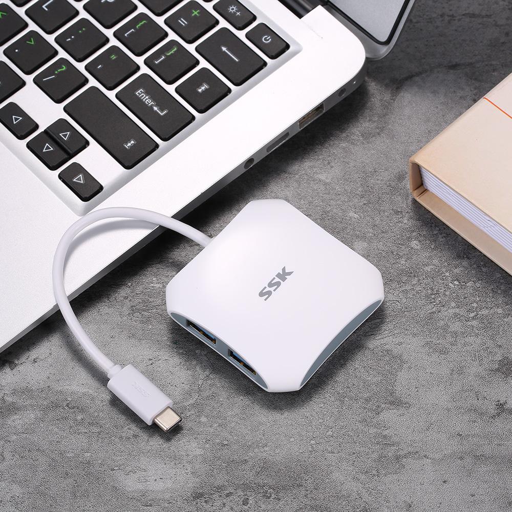SSK USB hub has extended 4 USB 3.0 ports which provide high data transfer speeds up to 5Gbp/s. Its type-C cable as long as 15cm, plug and play. No driver and adapter required, strong power