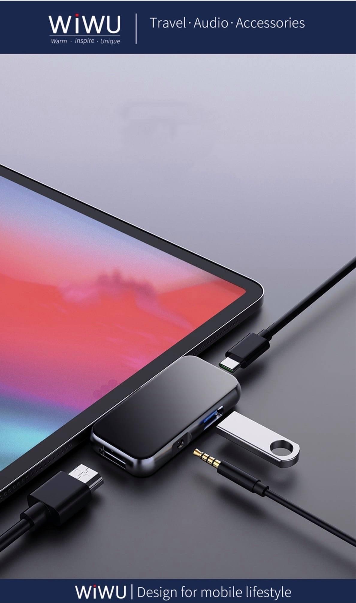 Hub WiWu Alpha 4 in 1 USB-C T5 Pro 1. Thương hiệu : WiWu 2. Mô tả sản phẩm - Thiết kế 4 trong 1: USB3.0 + HDMI + PD + giắc cắm 3,5 mm