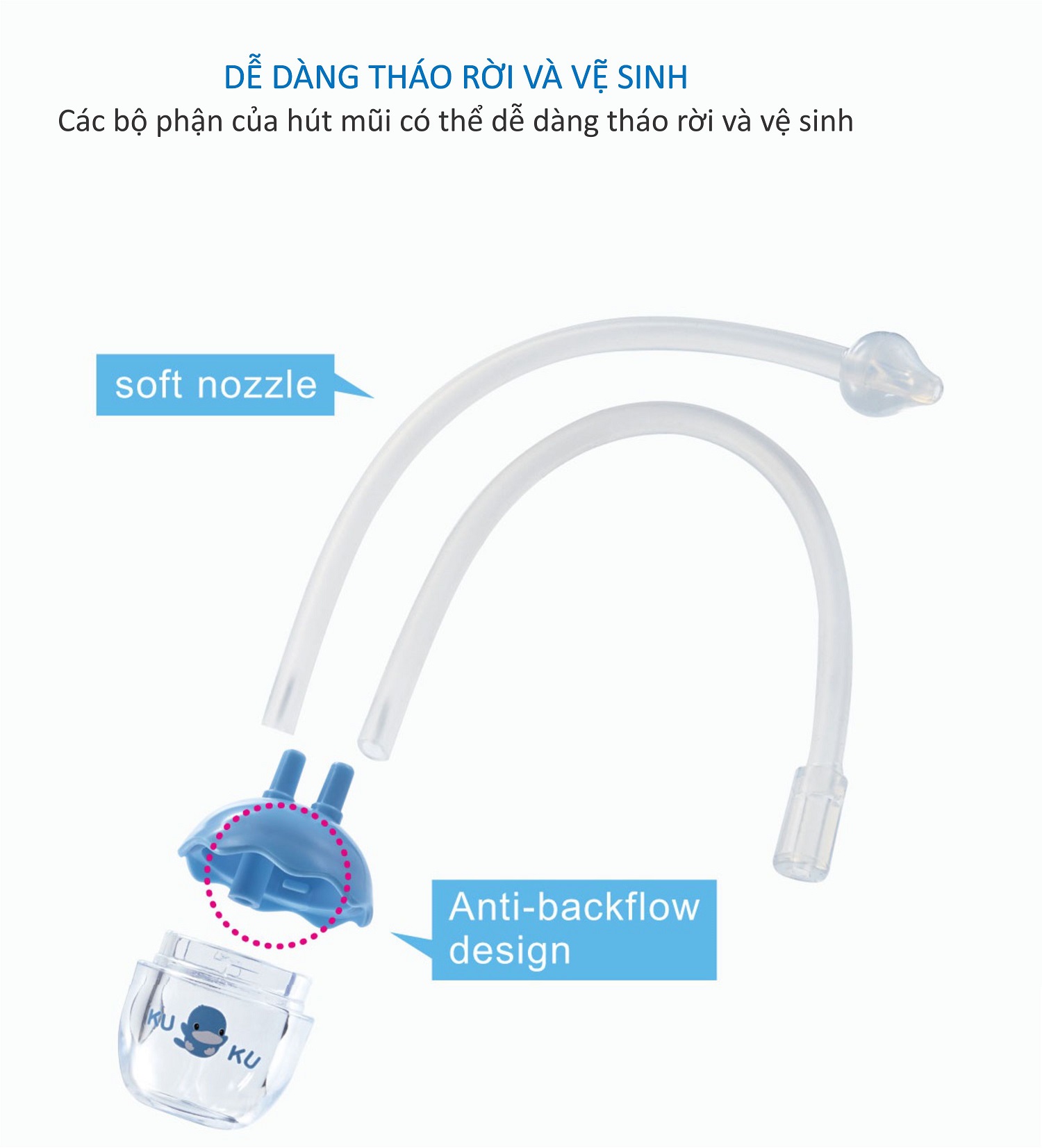 - Đầu ống hút mềm mại, linh hoạt, vừa vặn với mũi của bé. Thiết kế đầu hút tiếp xúc với lỗ mũi hình bầu dục không làm tổn thương niêm mạc mũi bé.
