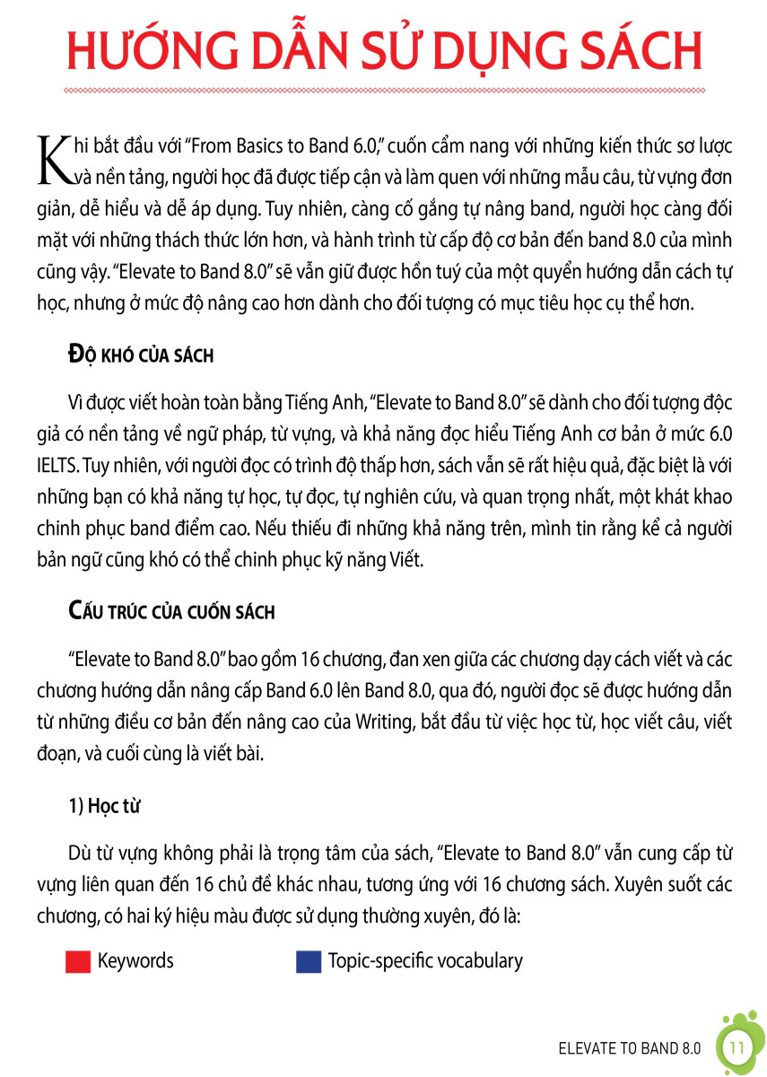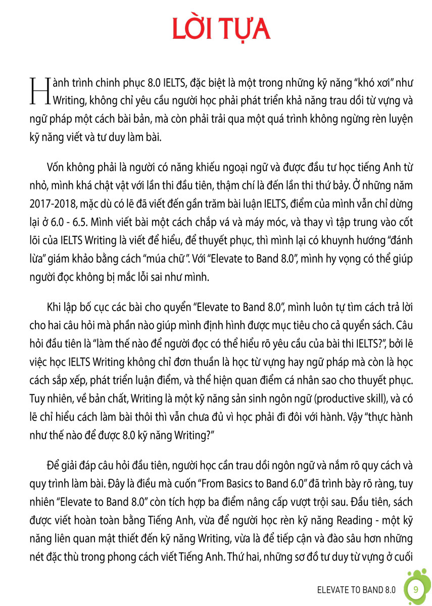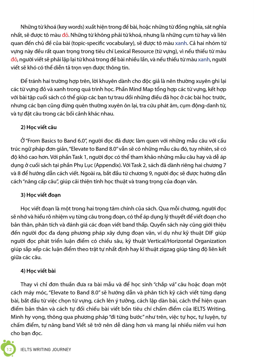 “Bình thường hoá’ các band điểm cao trong IELTS Writing với cuốn sách này! Hy sinh thân mình làm chuột bạch, Việt có kinh nghiệm đến gần 10 năm trong việc chinh phục kỳ thi IELTS. Có lẽ do vậy nên tác giả có thể chỉ ra rất rõ những kiến thức mà các bạn học sinh thật sự cần để đạt band 8.0+, cũng như các lỗi đang khiến các bạn mắc kẹt ở band 6.0 trong kỹ năng này. Cách viết bẻ nhỏ từng câu, từng đoạn trong mỗi dạng bài của IELTS Writing, kèm với các phần bài tập đi kèm, làm cho các kiến thức nâng cao của band 8.0 trở nên dễ tiếp cận hơn rất nhiều. Mỗi ngày chỉ cần đọc 1 chương hay 1 mục kiến thức thôi là bạn cũng sẽ nạp được siêu nhiều kiến thức chất lượng nên đừng sợ bị ngợp khi sử dụng sách nhé!”