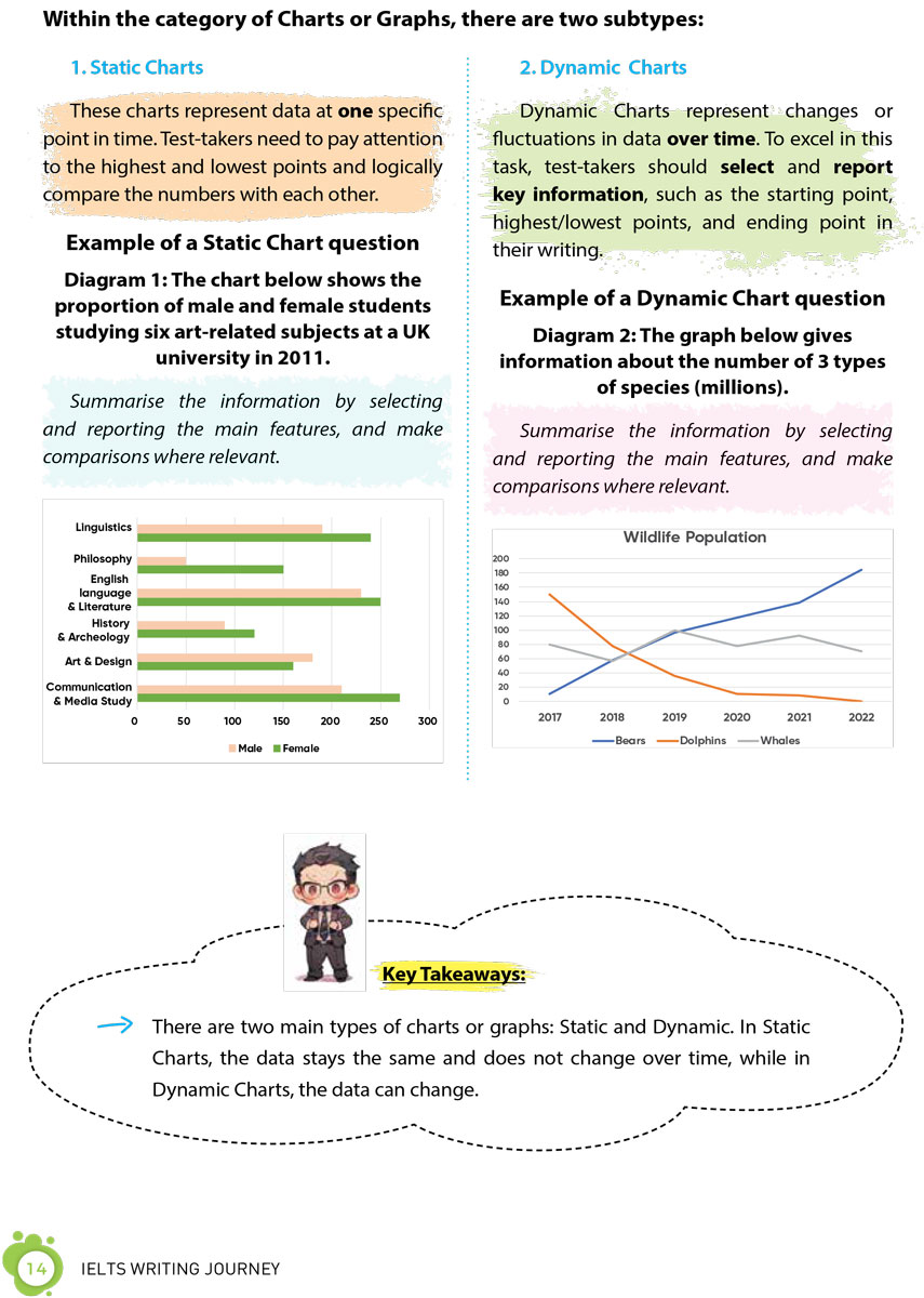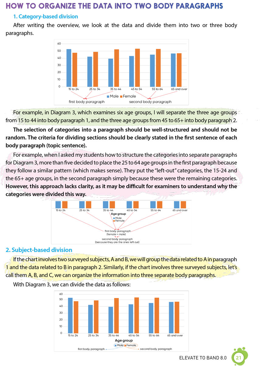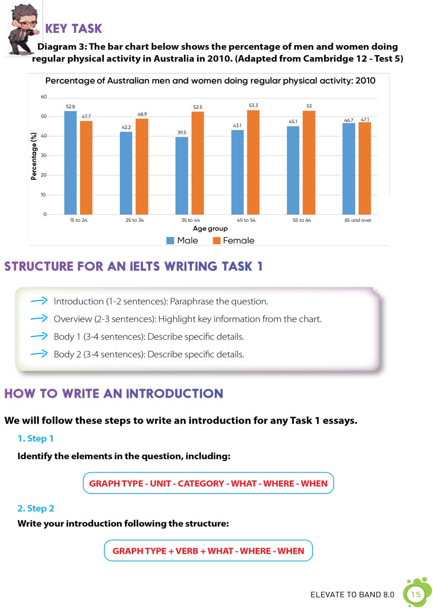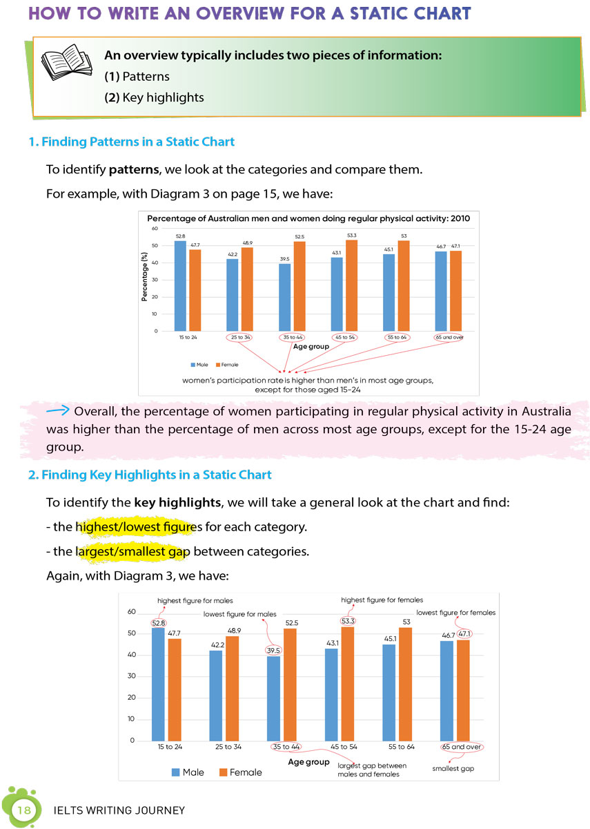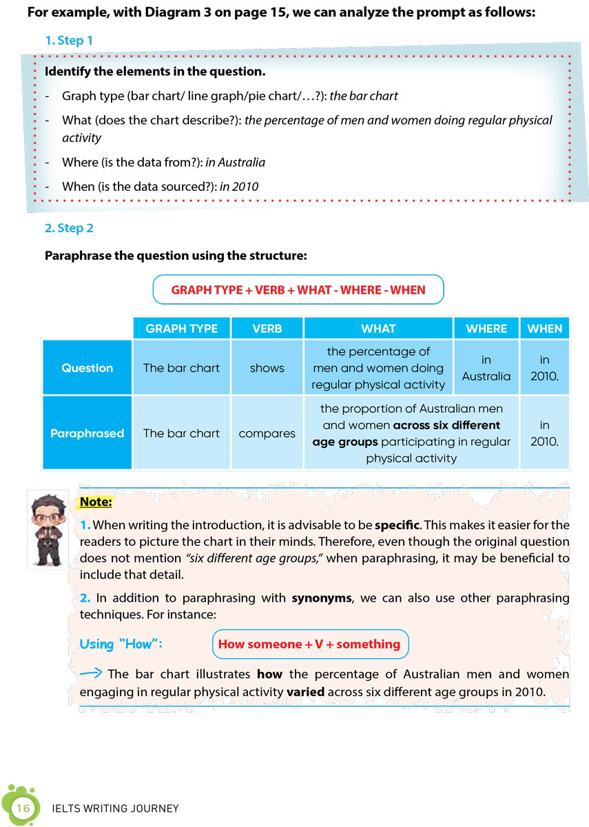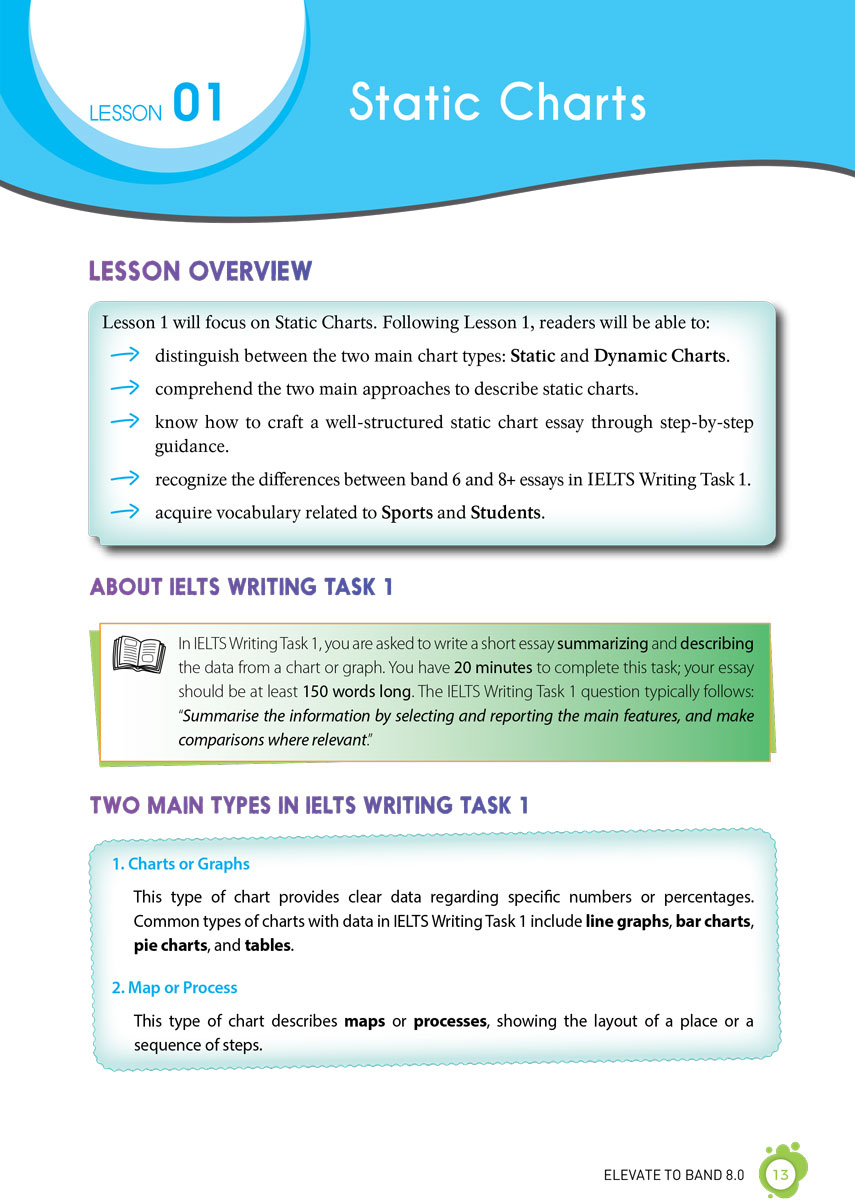 1. 16 chương sách với 24 chủ đề, hơn 200 từ vựng, 40 mẫu câu quan trọng ghi điểm cho cả Task 1 và Task 2.