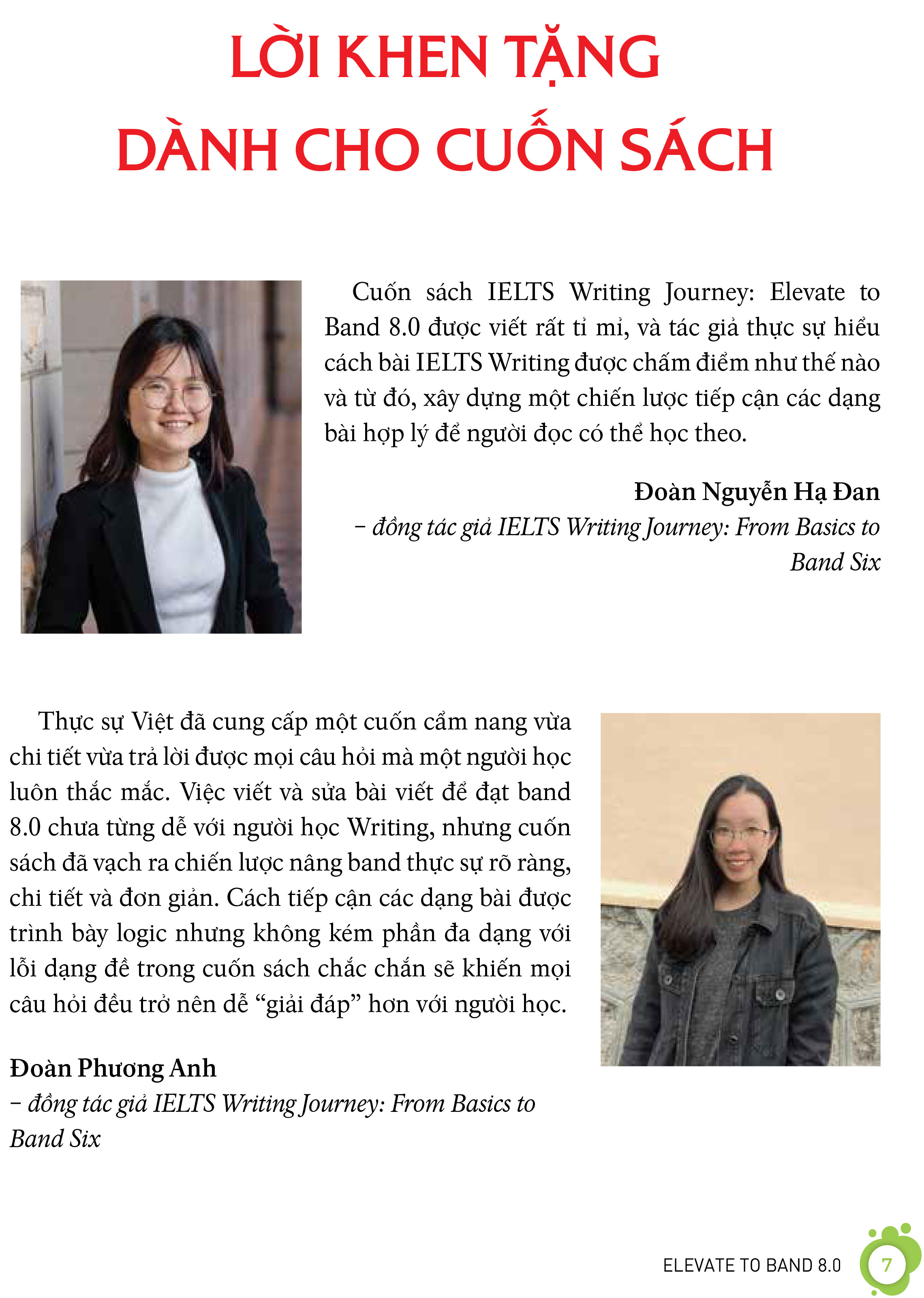 “Với cấu trúc chặt chẽ, hướng dẫn chi tiết, diễn đạt gần gũi, và cách trình bày bắt mắt, cuốn sách này chứa đầy đủ những gì bạn cần biết để đạt 8.0 Writing. Tôi tin rằng cuốn sách IELTS Writing Journey Elevate to Band 8 sẽ trở thành người bạn đồng hành đáng tin cậy, tiếp bước cho thí sinh vươn tới band điểm Writing mơ ước của mình.”