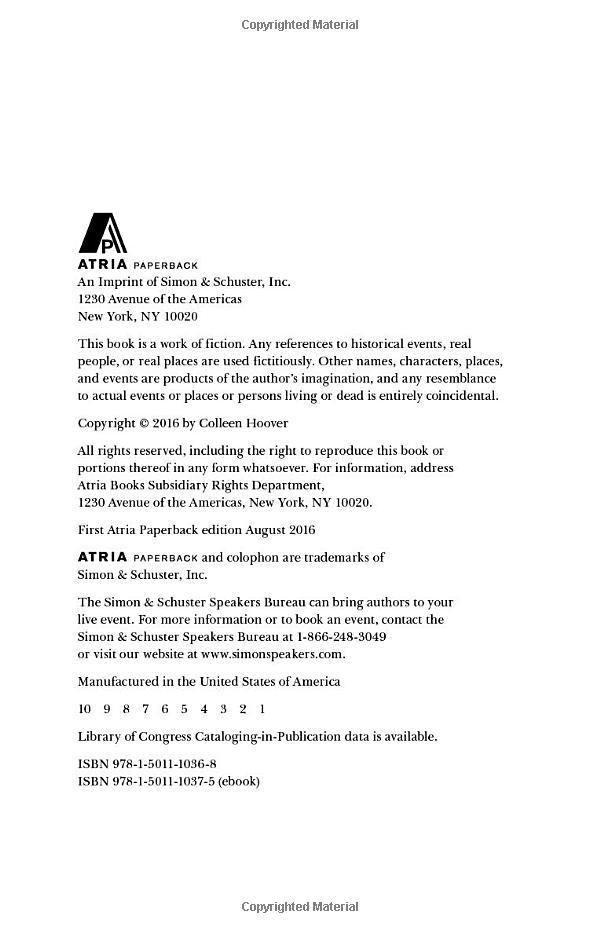 As questions about her new relationship overwhelm her, so do thoughts of Atlas Corrigan—her first love and a link to the past she left behind. He was her kindred spirit, her protector. When Atlas suddenly reappears, everything Lily has built with Ryle is threatened.