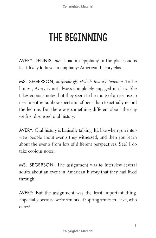 Post-breakup, Avery gets to thinking about all of the guys that she has ever dated. How come none of those relationships ever worked out? Could it be her fault? Avery decides to investigate. In history class she's learning about this method of record-keeping called "oral history" and she has a report due. So Avery decides to go directly to the source. Avery tracks down all of the guys she's ever dated, and uses that information, along with the thoughts of her friends, family, and even teachers to compile a total account of her dating history.