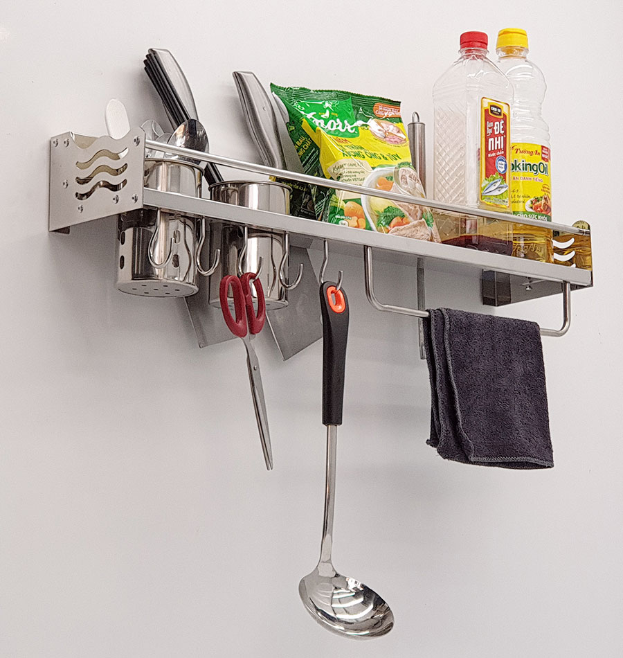 Mô tả chi tiết: Giá treo dụng cụ nhà bếp đa năng giúp bạn sắp xếp gọn gàng các vật dụng như dao, kéo, muỗng, thìa, phới lồng, bàn chải rửa chén, và nhiều loại