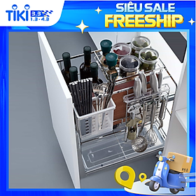 Giá đa năng để dao thớt, chai lọ, gia vị Chất liệu: inox 304 dạng nan tròn Phiên bản bát cánh ngăn kéo và mở cánh Ray âm giảm chấn Angas Độ rộng cánh: 200mm