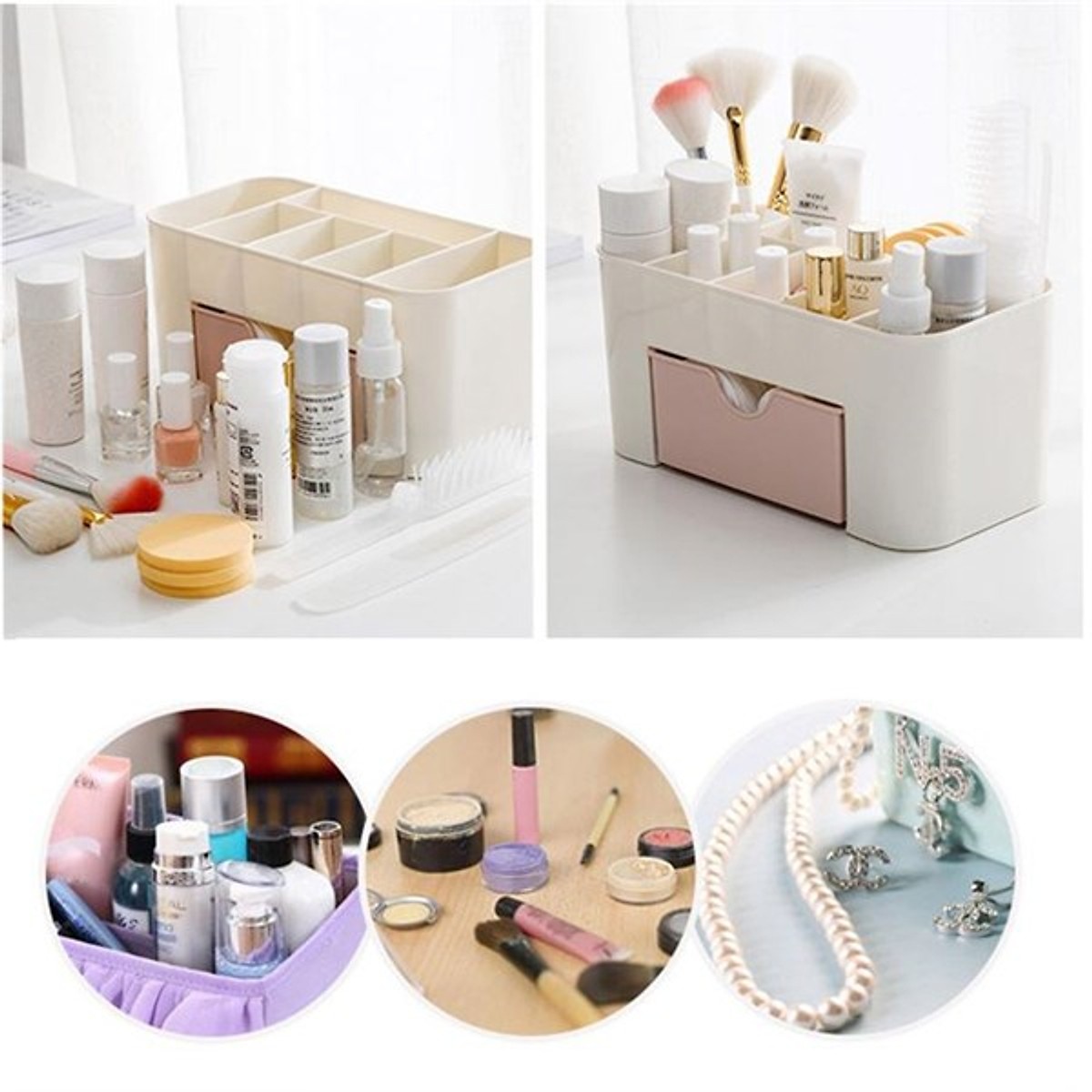 - Mỹ phẩm, đồ trang điểm và các phụ kiện làm đẹp như vòng tay, vòng cổ, khuyên tai, buộc tóc, … là những vật dụng cần thiết của phái đẹp nhưng cất giữ các vật ấy lẫn chung với đồ dùng khác sẽ khiến cho đồ đạc của bạn bị hư hỏng, mất đi form dáng ban đầu, ảnh hưởng đến công cuộc làm đẹp của chị em. Đôi khi cảm thấy bực mình khi tốn quá nhiều thời gian để đi tìm kiếm những món đồ cần dùng. Chúng tôi giới thiệu đến các bạn Kệ đựng mỹ phẩm ngăn kéo tiện dụng, xinh xắn giúp chị em sắp xếp các vật dụng cá nhân một cách gọn gàng, ngăn nắp tránh thất lạc và dễ dàng tìm kiếm khi cần.