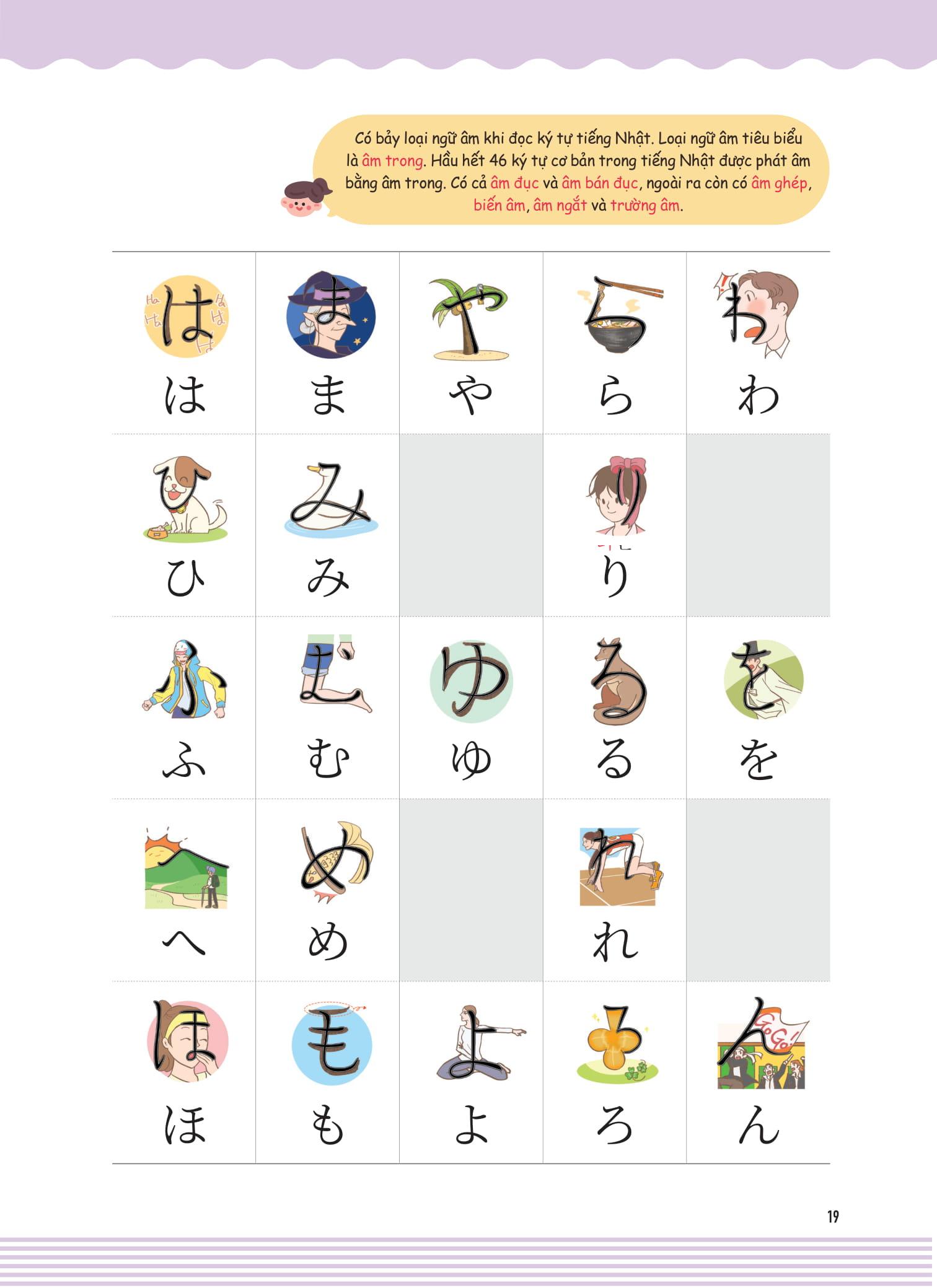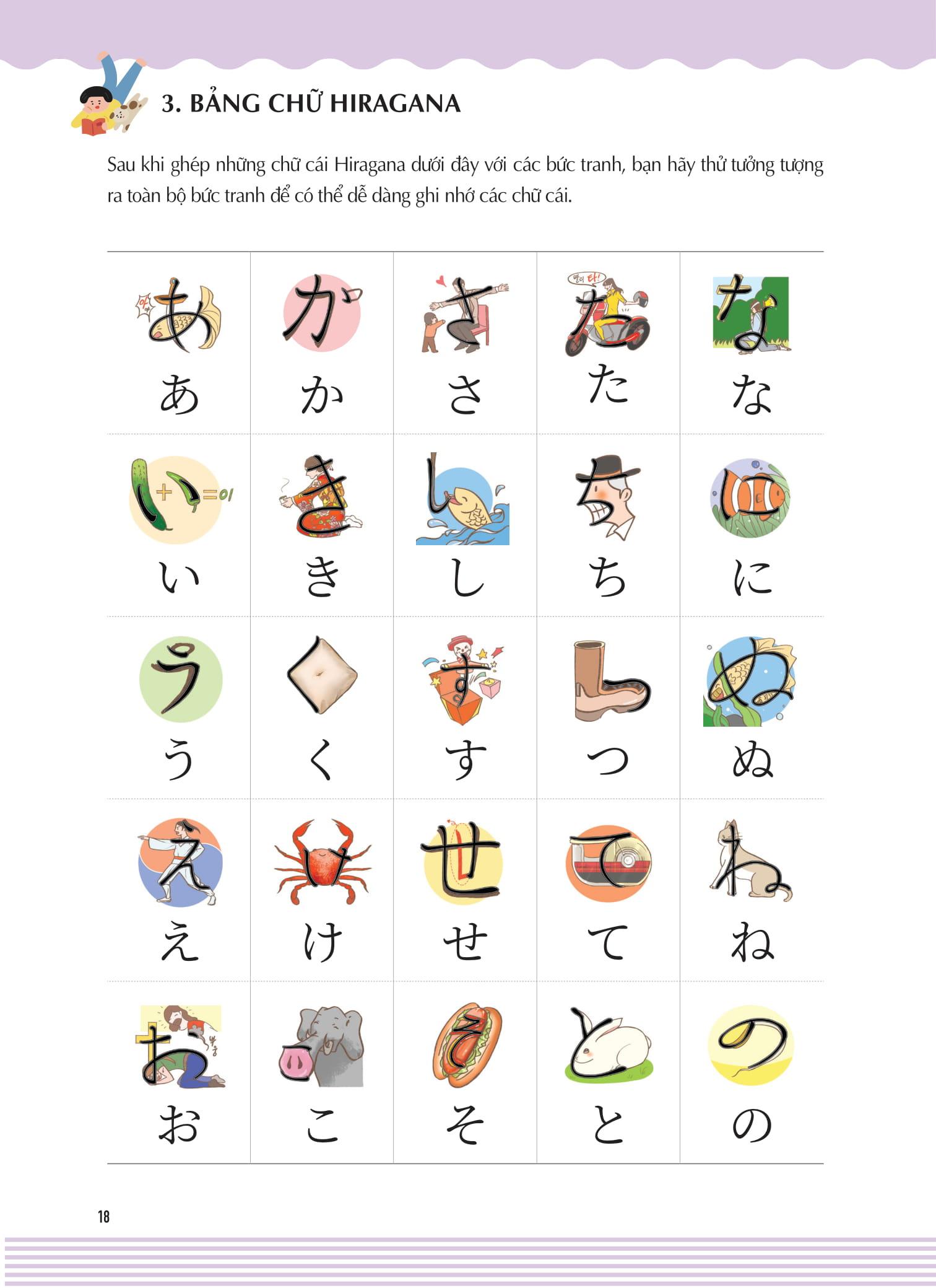 • Nhiều tranh minh họa phù hợp nhất với từng chữ viết để người học có thể phân biệt và ghi nhớ được các chữ cái Hiragana và Katakana
