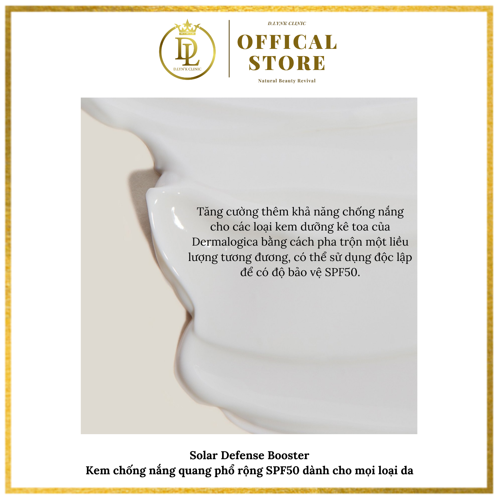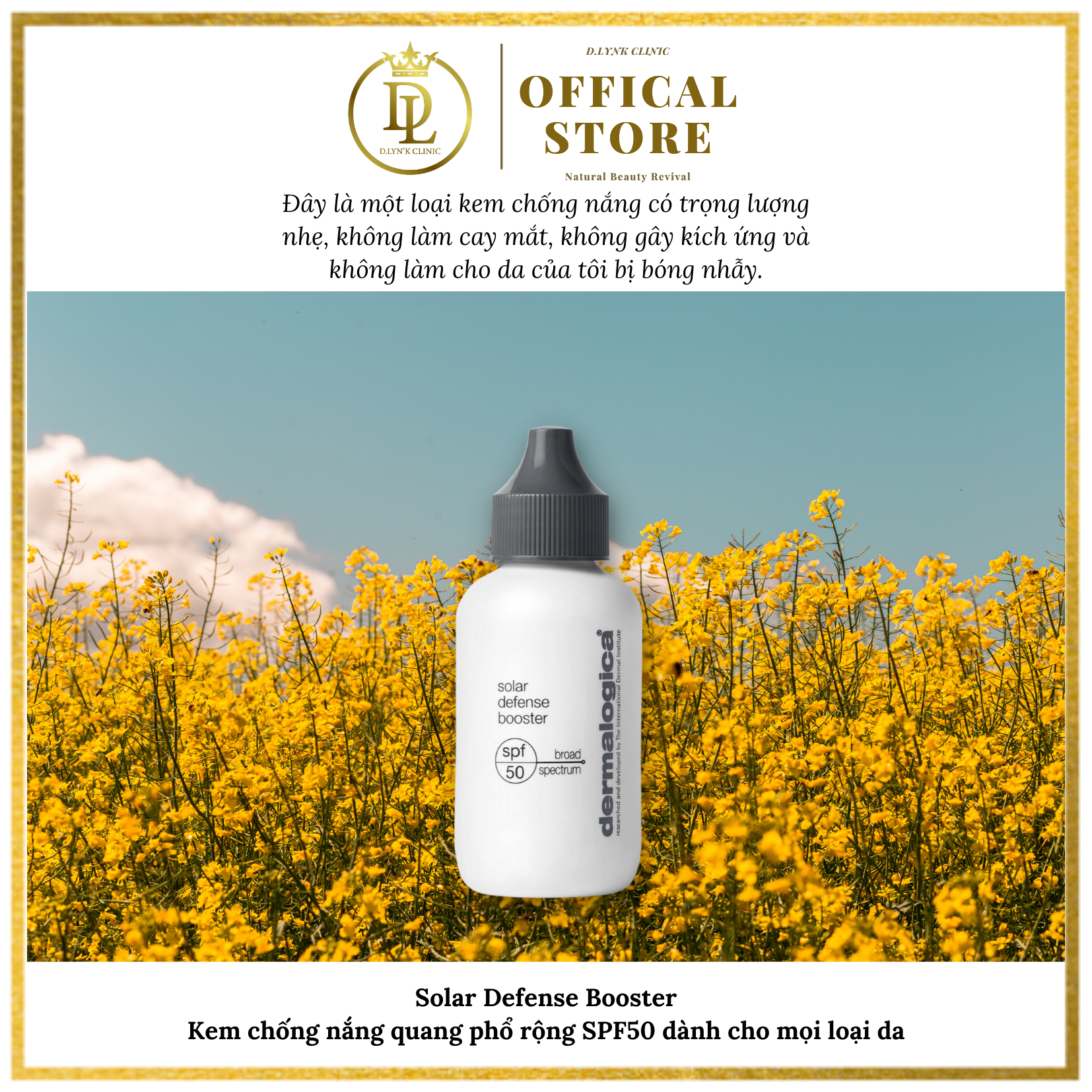 Solar Defense Booster Kem chống nắng quang phổ rộng SPF50 dành cho mọi loại da - Đây là một loại kem chống nắng có trọng lượng nhẹ, không làm cay mắt, không gây kích ứng và không làm cho da của tôi bị bóng nhẫy. Các thành phần chống oxy hóa giúp cải thiện sự mịn màng và mềm mại cho da bên cạnh việc chống các các tác hại từ gốc tự do. Công thức tối tân, không tạo sự trắng bệt trên da, và là lớp chắn vô hình giúp chống lại các tổn hại do sự tấn công từ môi trường Tăng cường thêm khả năng chống nắng cho các loại kem dưỡng kê toa của Dermalogica bằng cách pha trộn một liều lượng tương đương, có thể sử dụng độc lập để có độ bảo vệ SPF50. Bổ sung khả năng chống tia UVA và UVB thiết yếu cho kem dưỡng ẩm hoặc kem nền của bạn với kem chống nắng Quang Phổ Rộng. Công thức tối tân, không tạo sự trắng bệt trên da, và là lớp chắn vô hình giúp chống lại các tổn hại do sự tấn công từ môi trường. Các thành phần chống oxy hóa giúp cải thiện sự mịn màng và mềm mại cho da bên cạnh việc chống các các tác hại từ gốc tự do. Thành phần: Avobenzone, Octinoxate, Octisalate and Oxybenzone: Kem dưỡng hóa học cung cấp sự bảo vệ tia UVA va UVB tối ưu. Hạt Vitis Vinifera (Hạt Bưởi) và Camellia Sinensis (Trà Xanh): Chiết xuất dược thảo làm dịu chống oxy hóa và cung cấp việc chống enzyme. Magnesium Ascorbyl Phosphate (Vitamin C) và Tocopherol (Vitamin E): Chống oxy hóa để cải thiện sự mềm mại của làn da, giúp kiểm soát tổn thương do gốc tự do gây ra.