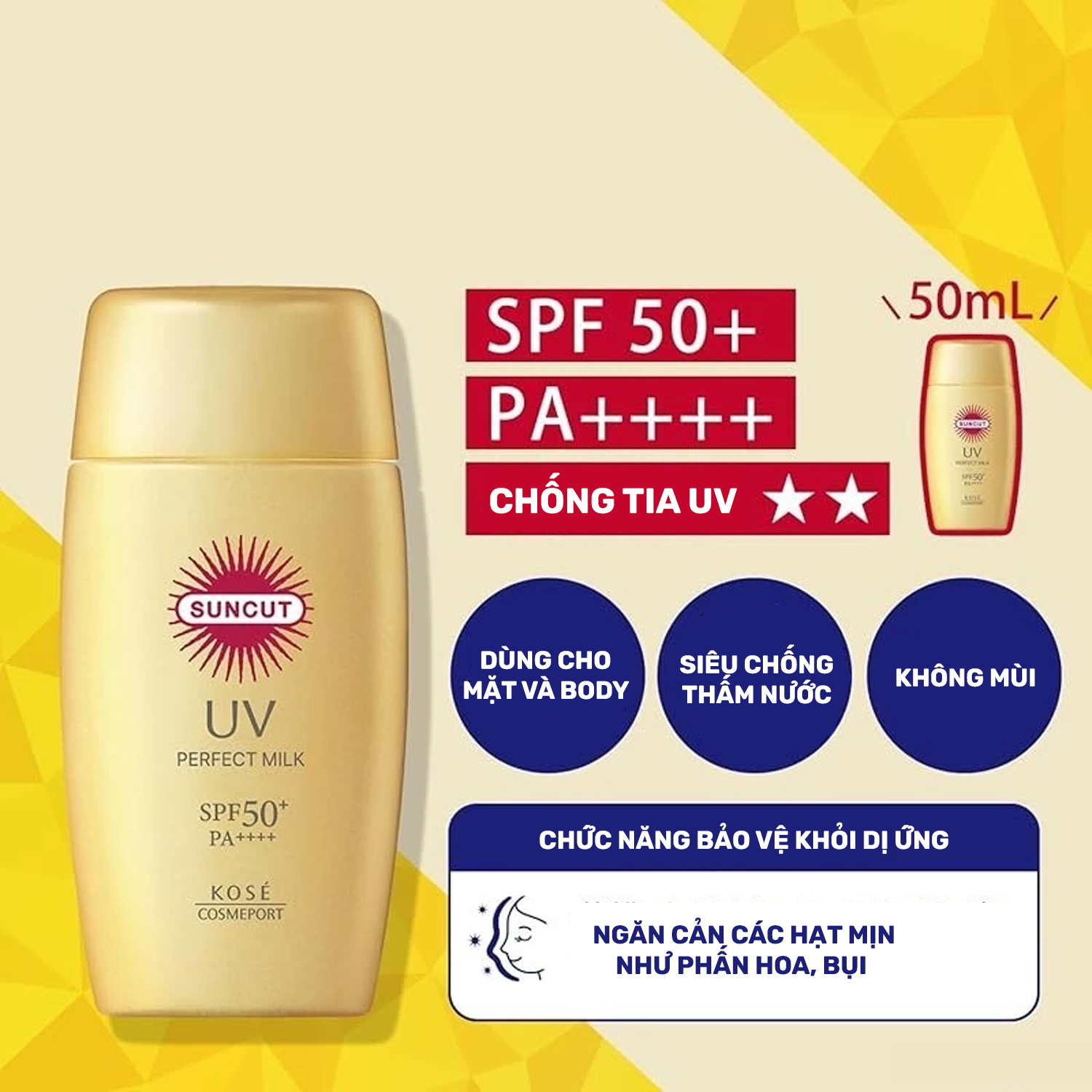 Công Dụng Kem Chống Nắng Siêu Chống Thấm Nước Kose Suncut UV Perfect Essence Super Water Proof SPF50+ PA++++: Sản phẩm chống nắng giúp bảo vệ da dưới tác động của ánh nắng mặt trời, giúp làm trắng da, dưỡng ẩm cho da, cho làn da tươi sáng, khỏe đẹp.
