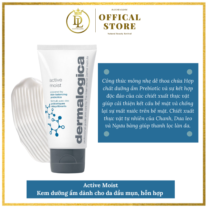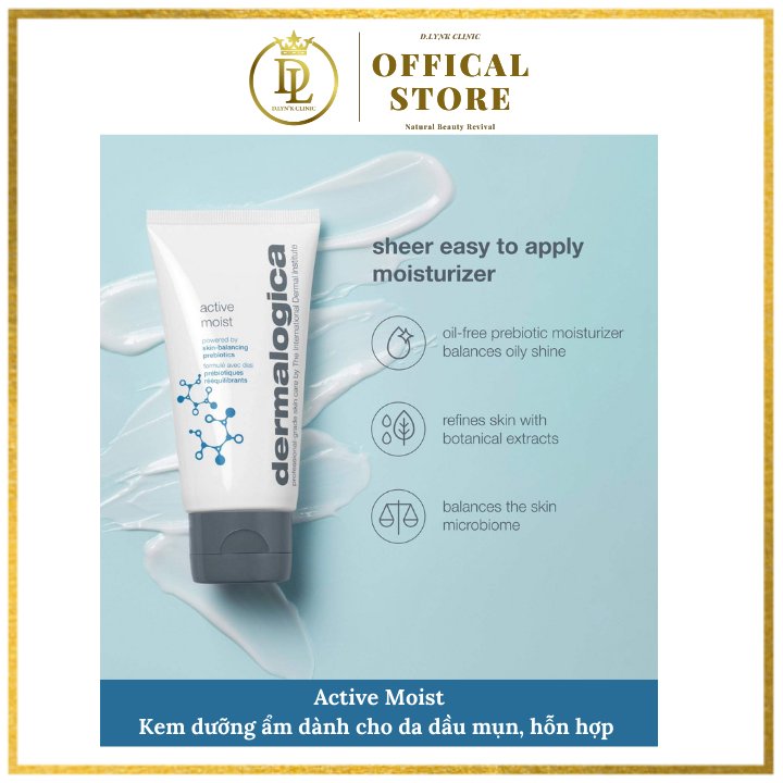 Mua tại TiktokKem dưỡng da Dermalogica Active Moist 100 ml dành cho da dầu Kem dưỡng ẩm cho da dầu Dermalogica Active Moist có khả năng thẩm thấu nhanh và không để lại cảm giác nhờn rít trên da, giúp cung cấp độ ẩm sâu cho da, làm mịn và cải thiện rõ rệt bề mặt da. Sự kết hợp của thành phần silk amino acid cùng các chiết xuất thảo mộc giúp làm mềm mịn và khôi phục khả năng tự bảo vệ da. Ngoài ra, chiết xuất cải xoong, ngưu bàng, thường xuân… giúp tái tạo và cung cấp độ ẩm sâu cho da. Đặc biệt, sản phẩm kem dưỡng ẩm này không chứa màu và hương liệu nhân tạo nên đảm bảo an toàn cho da. Đây cũng là sản phẩm được khuyên dùng bởi các chuyên gia. THÔNG TIN SẢN PHẨM
