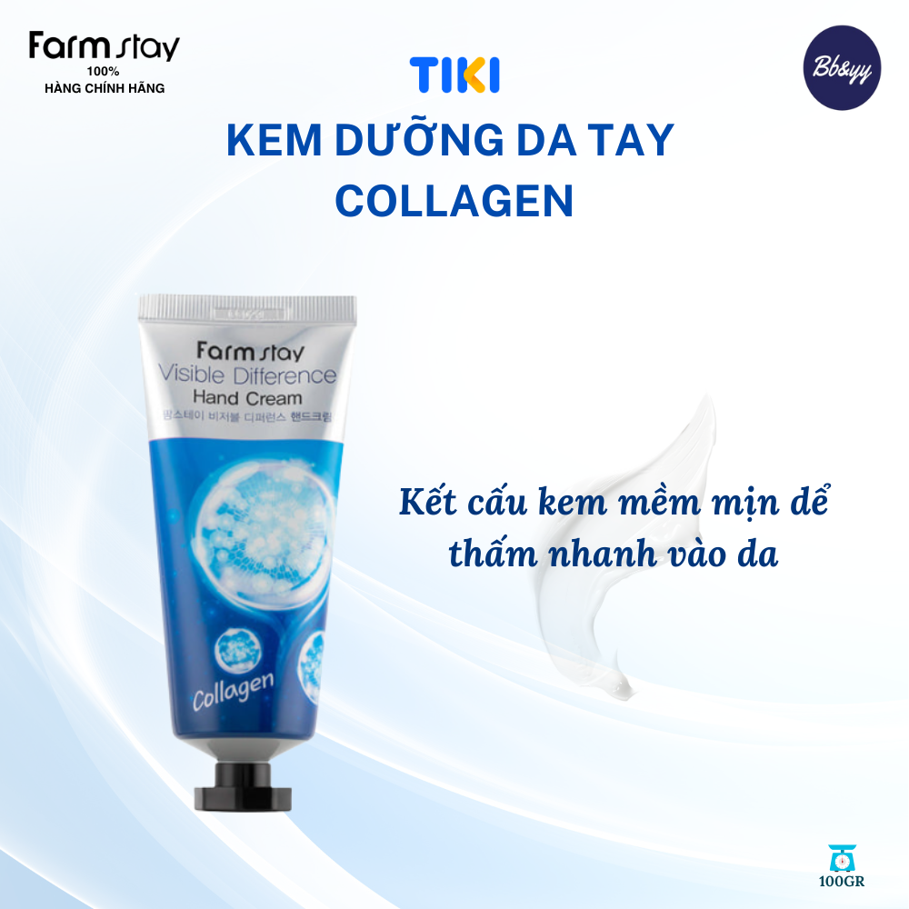 KEM DƯỠNG DA TAY COLLAGEN _ FARMSTAY COLLAGEN VISIBLE DIFFERENCE HAND CREAM THÀNH PHẦN: Xem trên bao bì sản phẩm. CÔNG DỤNG: - Giúp da tay đàn hồi, săn chắc, mịn màng và giữ ẩm
