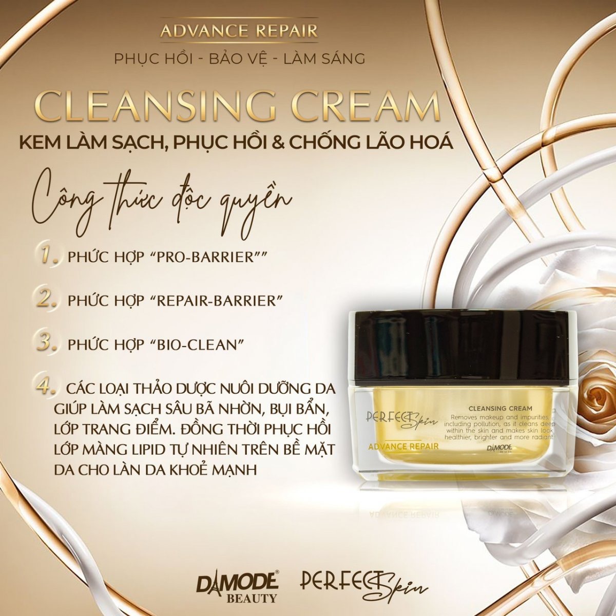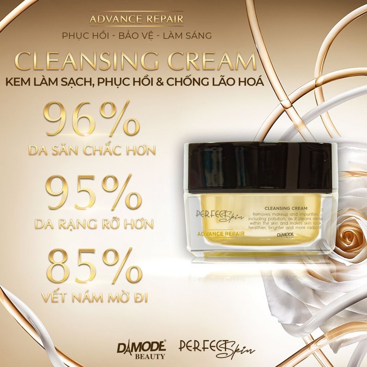 - Công dụng: Kem làm sạch sâu bụi bẩn, bả nhờn, lớp trang điểm, phục hồi hàng rào lipit bảo vệ da, chống lão hoá da. Cleansing Cream là dòng kem làm sạch da đang được đông đảo chị em lựa chọn. Sản phẩm không chỉ hỗ trợ làm sạch da, loại bỏ bụi bẩn và các lớp makeup mà còn chăm sóc và phục hồi làn da hiệu quả. Cùng Damode tìm hiểu chi tiết hơn về dòng sản phẩm này ngay sau đây nhé. Giới thiệu về sản phẩm Cleansing Cream Cleansing Cream là kem tẩy trang làm sạch da quen thuộc đối với các tín đồ chăm sóc sắc đẹp. Sản phẩm được ứng dụng công nghệ độc quyền cùng với các thành phần tự nhiên cho khả năng làm sạch da an toàn và hiệu quả. Hiệu quả bất ngờ từ Cleansing Cream chỉ sau 2 tuần sử dụng Trong các sản phẩm làm sạch da, Cleansing Cream được Damode phân phối rất phổ biến trên thị trường và nhận lại các phản hồi tích cực. Sản phẩm với công thức 20 – 10 – 5 – 3 giúp không chỉ làm sạch mà còn bảo vệ làn da của bạn hiệu quả. Cụ thể: