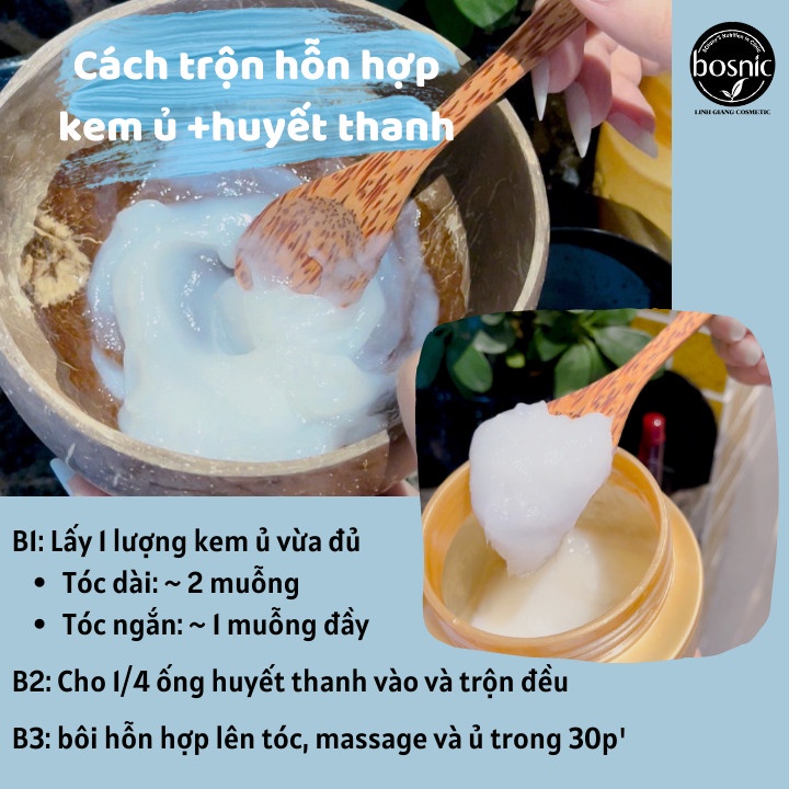 - Lấy 1 lượng kem ủ vừa đủ cho toàn bộ tóc, nhỏ thêm 1/3 ống Huyết thanh Shining Plus vào và trộn đều hỗn hợp (nên trộn bằng chén sẽ đều hơn)
