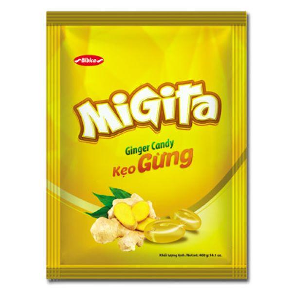 Kẹo cứng Migita gừng túi 400 gam - Bibica Loại kẹo: Kẹo gừng Khối lượng: 400g Số lượng: 143 viên/túi (2.8g/viên)/ 20 túi/ thùng Sản xuất: Việt Nam Ưu điểm: Kết hợp hoàn hảo vị