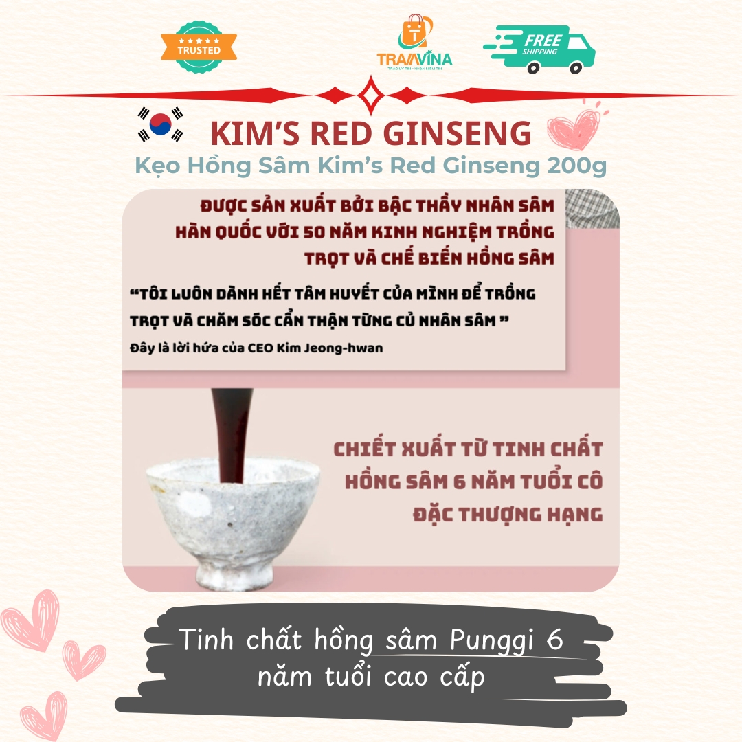 Mua tại TiktokKẹo Hồng Sâm Kim’s Red Ginseng 200g Kimsredginseng là thương hiệu hồng sâm 6 năm tuổi với lịch sử 50 năm. Được sáng lập bởi Kim Jeong Hwan, Giám đốc điều hành của Tập đoàn nhân sâm Punggi và là một bậc thầy về nhân sâm Hàn Quốc. Kẹo hồng sâm sở hữu hương vị và mùi thơm đậm đà, sâu lắng của hồng sâm nhờ chứa tinh chất hồng sâm nguyên chất từ nhân sâm Punggi 6 năm tuổi cao cấp. Sản phẩm được đóng gói riêng biệt, tiện lợi thưởng thức, là lựa chọn quà tặng hoặc ăn vặt hàng ngày với bao bì đa dạng và sang trọng