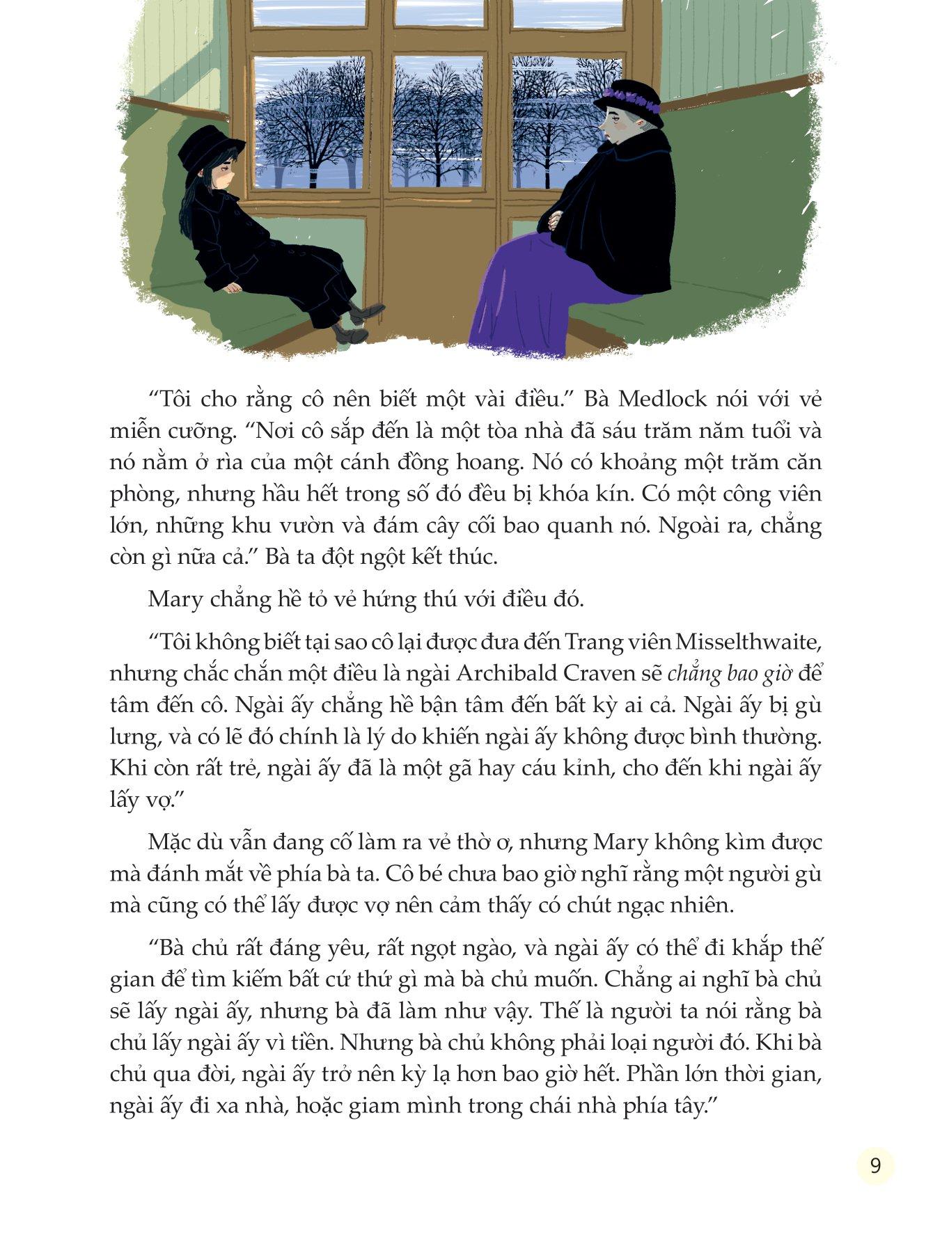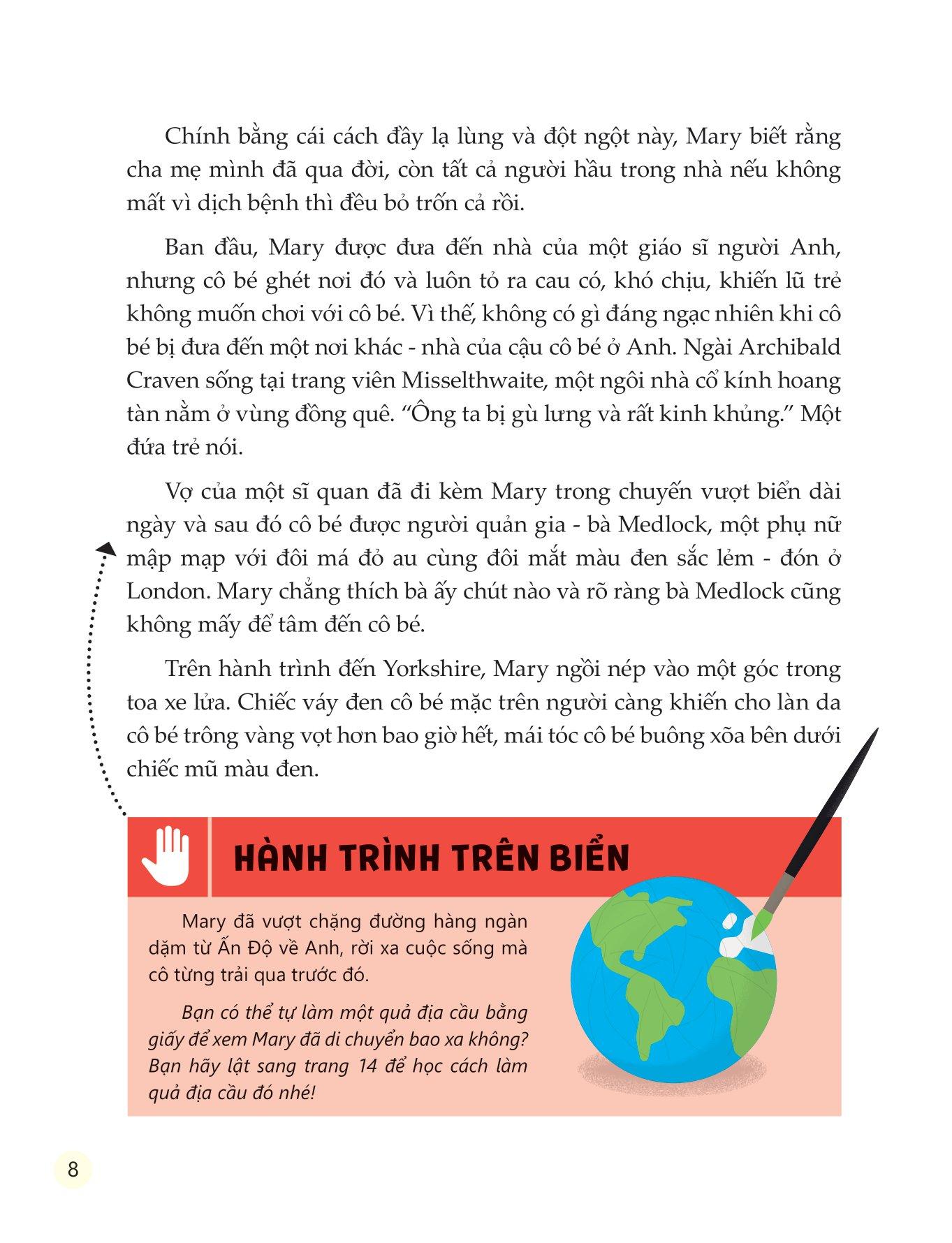 Mọi người đều nói Mary Lennox có vẻ ngoài chẳng ai ưa nổi, cái mặt gầy choắt còn biểu cảm thì cau có, khó gần. Mary sinh ra ở Ấn Độ. Cha của cô bé làm việc cho chính phủ Anh, còn mẹ cô bé là một phụ nữ vô cùng xinh đẹp, có điều dường như họ chẳng hề bận tâm đến việc nuôi dạy đứa con gái nhỏ của m.ình. Lúc nào Mary cũng ở cùng bảo mẫu và bị tách xa khỏi cha mẹ hết mức có thể. Mẹ của Mary không thích nghe thấy tiếng khóc của con gái m.ình, cho nên những người hầu trong nhà luôn cố gắng chiều theo mọi yêu cầu của cô bé. Bởi thế mà chẳng có gì đáng ngạc nhiên khi lớn lên, cô bé lại trở thành một đứa trẻ ích kỷ.
