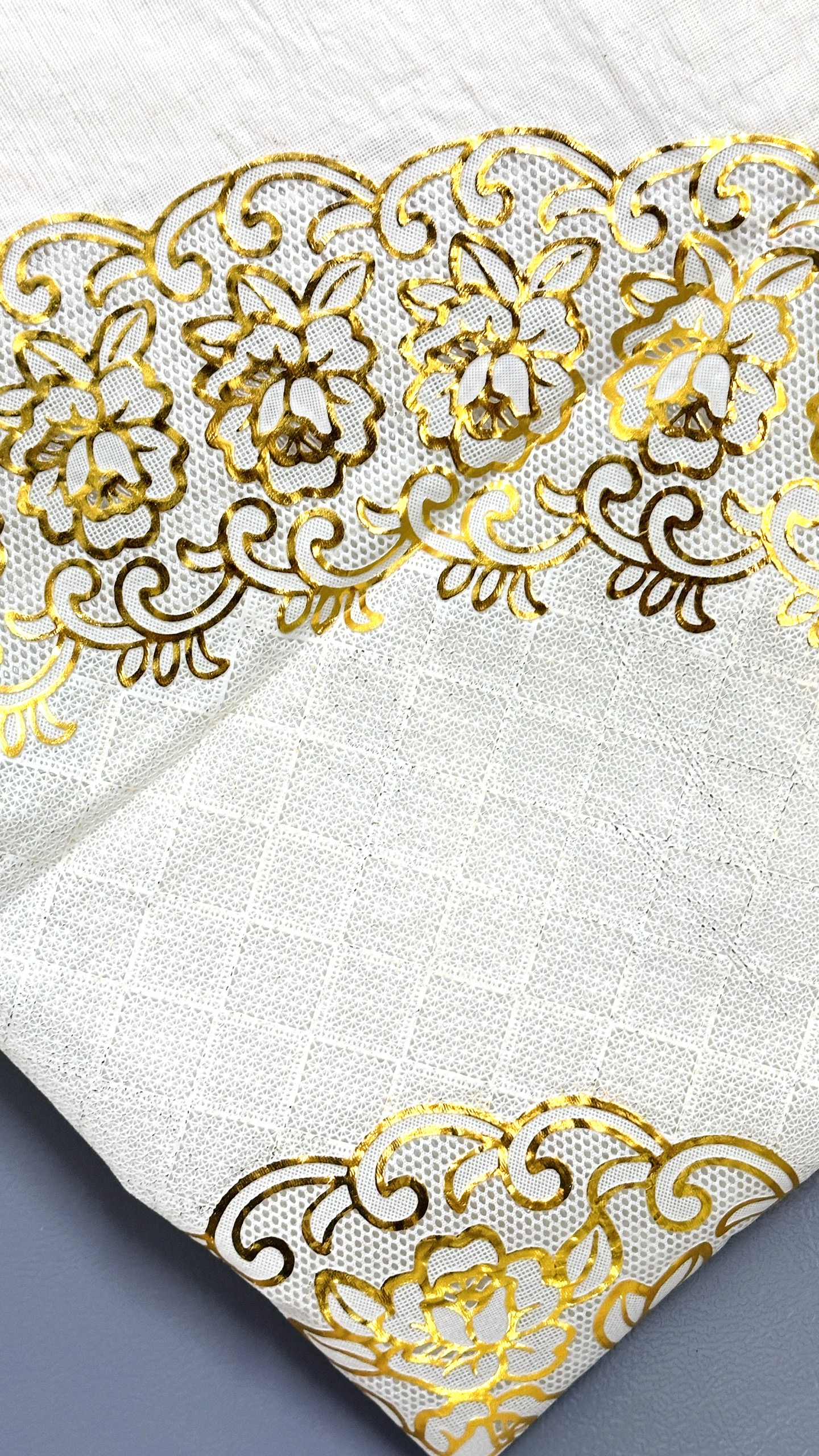 - Khăn Trải Bàn W.751 (90 x 150 cm) kiểu dáng khăn hình chữ nhật kết hợp hoa văn nổi - nhũ vàng, góp phần tô điểm cho không gian bàn ăn thêm sang trọng,