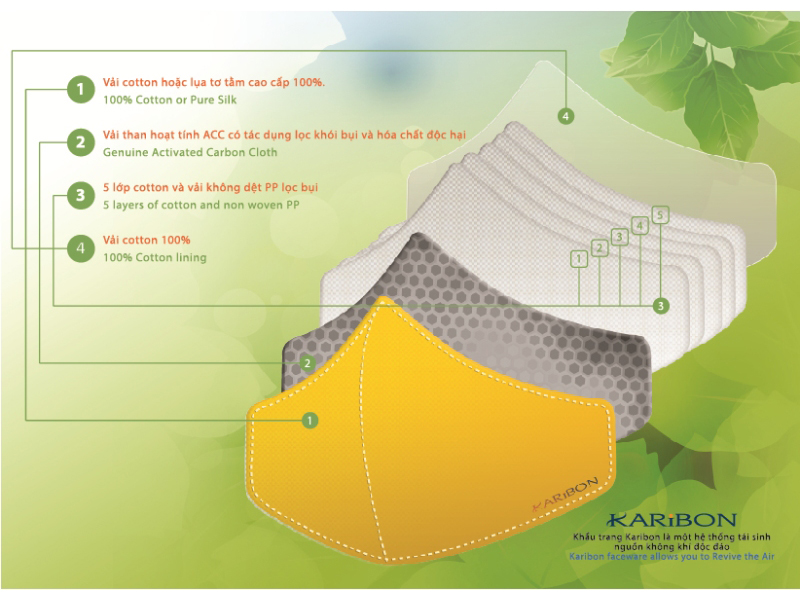 - Đặc biệt, lớp vải than hoạt tính ACC (Activated Carbon Cloth) đã được tiến hành những lần giặt mạnh thử nghiệm khác nhau và khẳng định rằng sau 25 lần giặt, khẩu trang Karibon vẫn có khả năng ngăn giữ được các hoá chất độc hại - tương đương với 6 tháng sử dụng - duy trì được khả năng loại bỏ những phần tử bụi nhỏ và các chất hữu cơ gây hại cho sức khoẻ. Cấu tạo 8 lớp khẩu trang Karibon Cotton Khả năng lọc bụi lên đến 99% Tại phòng thí nghiệm Nelson Labolatories Hoa Kỳ, khẩu trang Karibon được xác định có thể ngăn các phân tử bụi nhỏ đến 0.3 micrometer, lọc đến 99% vi khuẩn, tương đương với khả năng lọc bụi của khẩu trang theo tiêu chuẩn Hoa Kỳ N95. Tại Việt Nam, khẩu trang Karibon đã được Viện Nghiên cứu Bảo hộ lao động chứng nhận đạt tiêu chuẩn TCVN 7312:2003 Mềm mại, thông thoáng, không gây khó chịu cho người dùng Với chất liệu lớp lót bằng vải 100% cotton, khẩu trang Karibon mềm mại khi tiếp xúc với da mặt. Phần quai đeo có thể điều chỉnh độ dài cho phù hợp với khuôn mặt từng người. Hướng dẫn sử dụng và bảo quản Không bẻ gập kẹp mũi ở chính giữa mà chỉ dùng tay ép kẹp mũi vào 2 bên sống mũi để khẩu trang ôm vừa vào khuôn mặt, đảm bảo bịt kín các khe hở. Điều chỉnh dây đeo tai cho vừa vặn. Nên giặt khẩu trang Karibon bằng tay nhẹ nhàng bột giặt nước vì bột giặt có hoá chất sẽ làm giảm khả năng hút giữ các chất hữu cơ độc hại của lớp vải than hoạt tính. Không là, không cho vào máy sấy. Nên thay khẩu trang sáu tháng một lần.