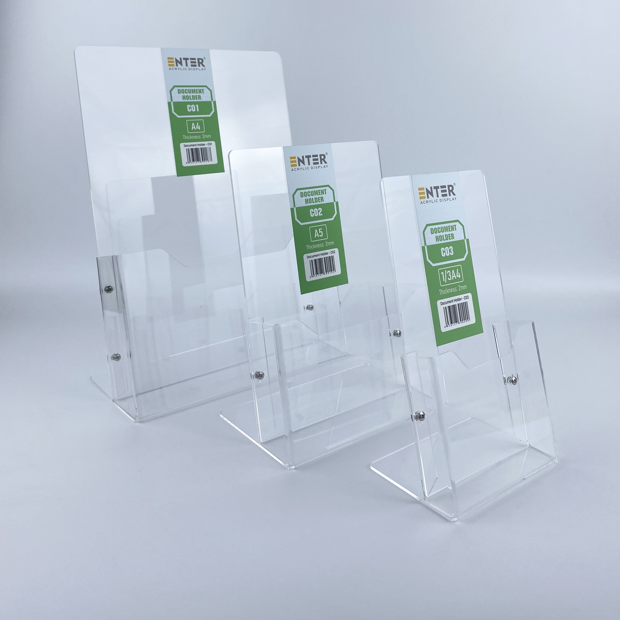 Mô tả sản phẩm Mã barcode Quy cách Đơn vị tính Đóng gói Thương hiệu Xuất xứ E18 Thân mica 100 x 150mm Đế mica 105 x 70 x 20mm Cái/Thùng 1/20 Enter Việt Nam E19 Thân mica 100 x 180mm Đế mica 105 x 70 x 20mm Cái/Thùng 1/20 Enter Việt Nam E20 Thân mica 100 x 210mm Đế mica 105 x 70 x 20mm Cái/Thùng 1/20 Enter Việt Nam E21 Thân mica 150 x 210mm Đế mica 155 x 80 x 20mm Cái/Thùng 1/20 Enter Việt Nam