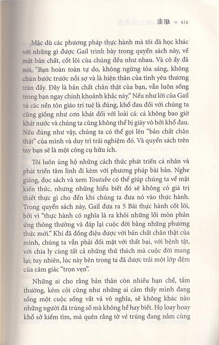 - Sách của Gail không chỉ hướng dẫn cho chúng ta con đường đi thẳng đến tự do, mà còn mô tả chi tiết những suy nghĩ và cảm xúc ngăn cản ta đến được con đường đó. Quyển sách được trình bày một cách bài bản với cấu trúc hợp lý, bao gồm những hiểu biết sâu sắc về tâm lý học cùng các bài tập tự thực hành, phù hợp cho cả người mới bắt đầu lẫn những ai đã nhận biết được bản chất chân thật của họ từ trước đó. Được viết bằng văn phong giản dị, quyển sách là trí tuệ từ bi, là hiện thân đẹp đẽ và đầy cảm hứng của Sự sống, là bàn tay dịu dàng dẫn dắt người đọc đi trên “con đường trở về thiêng liêng”. Và nhờ có Gail, bản thân tôi cũng biết thêm một vài lối đi tắt để trở về nhà! (Tiến sĩ Grace Bubeck, chuyên viên trị liệu, giảng viên thiền định, cố vấn tâm linh và nhà sáng lập của chương trình sự kiện trực tuyến Sống từ Yêu thương) Về Tác giả - Gali Brenner Tác giả Gail Brenner la tiến sĩ tâm lý học lâm sàng với 20 năm kinh nghiệm trong ngành trị liệu tâm lý. Bà hiện là thành viên của khoa lâm sàng tại Đại học California, San Francisco Nhiều bài nghiên cứu của bà được công bố, chủ yếu liên quan đến việc đối phó với căng thẳng tâm lý, các bệnh nội khoa mãn tính, quá trinh lão hóa và phương pháp chăm sóc cho bệnh nhân mất trí nhớ Gail còn là một blogger chuyên viết bài cộng tác cho các trang báo uy tín như CNN, Huffington Post, Zen Habits, MindBodyGreen, Tiny Buddha, Ispire Me Today và Tạp chí Undivided. Sách của bà là những hiểu biết về mặt tâm linh, giúp người đọc có cái nhìn sáng suốt và giàu lòng trắc ẩn hơn với những thử thách trong đời sống thường nhật.