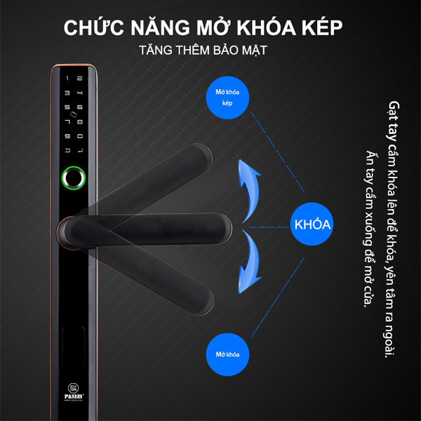Khóa vân tay cửa nhôm PASINI PS01AB35 chức năng mở khóa kép tăng thêm bảo mật. Gạt tay cầm khóa lên để khóa, yên tâm ra ngoài, ấn tay cầm xuống để mở cửa.
