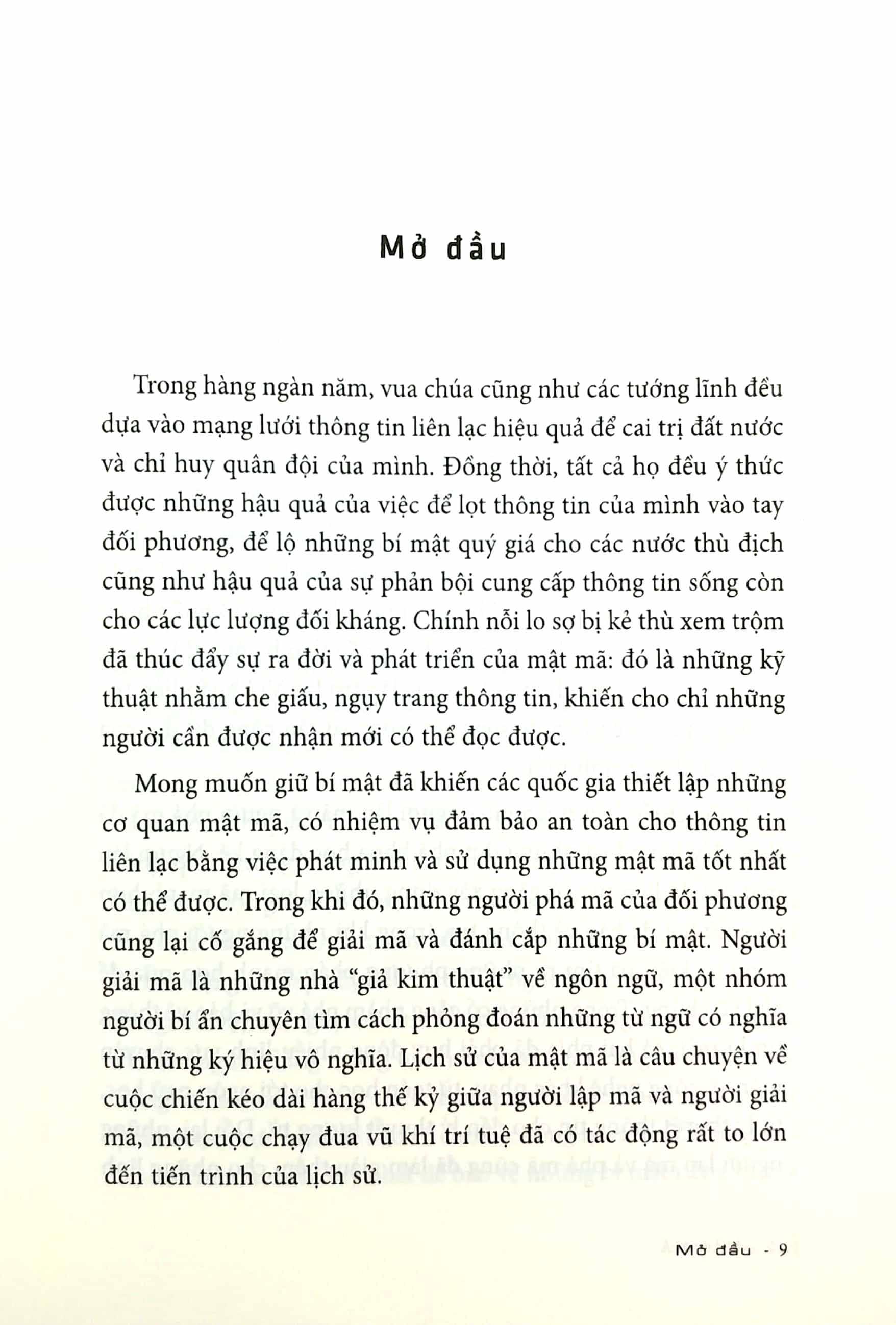 Trong hàng ngàn năm, vua chúa cũng như các tướng lĩnh đều dựa vào mạng lưới thông tin liên lạc hiệu quả để cai trị đất nước và chỉ huy quân đội của m.ình. Đồng thời, tất cả họ đều ý thức được những hậu quả của việc để lọt thông tin vào tay đối phương, để lộ những bí mật quý giá cho các nước thù địch. Chính nỗi lo sợ bị kẻ thù xem trộm đã thúc đẩy sự ra đời và phát triển của mật mã: đó là những kỹ thuật nhằm che giấu, ngụy trang thông tin, khiến cho chỉ những người cần nhận mới có thể đọc được. Mong muốn giữ bí mật đã khiến các quốc gia thiết lập những cơ quan mật mã, có nhiệm vụ đảm bảo an toàn cho thông tin liên lạc bằng việc phát minh và sử dụng những mật mã tốt nhất có thể được. Trong khi đó, những người phá mã của đối phương cũng lại cố gắng để giải mã và đánh cắp bí mật. Người giải mã là những nhà “giả kim thuật” về ngôn ngữ, một nhóm người bí ẩn chuyên tìm cách phỏng đoán những từ ngữ có nghĩa từ những ký hiệu vô nghĩa. Lịch sử của mật mã là câu chuyện về cuộc chiến kéo dài hàng thế kỷ giữa người lập mã và người giải mã, cuộc chạy đua v.ũ khí trí tuệ đã có tác động rất to lớn đến tiến trình của lịch sử.