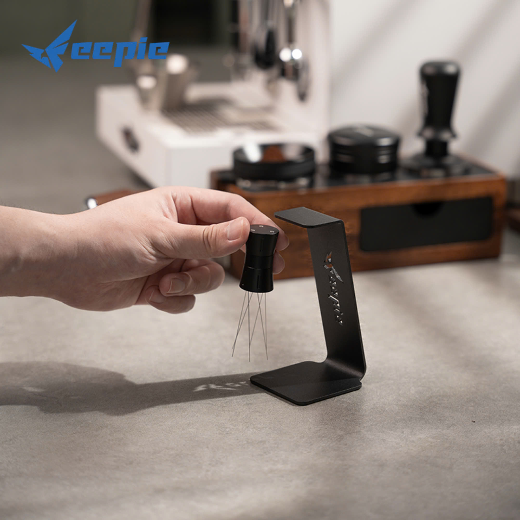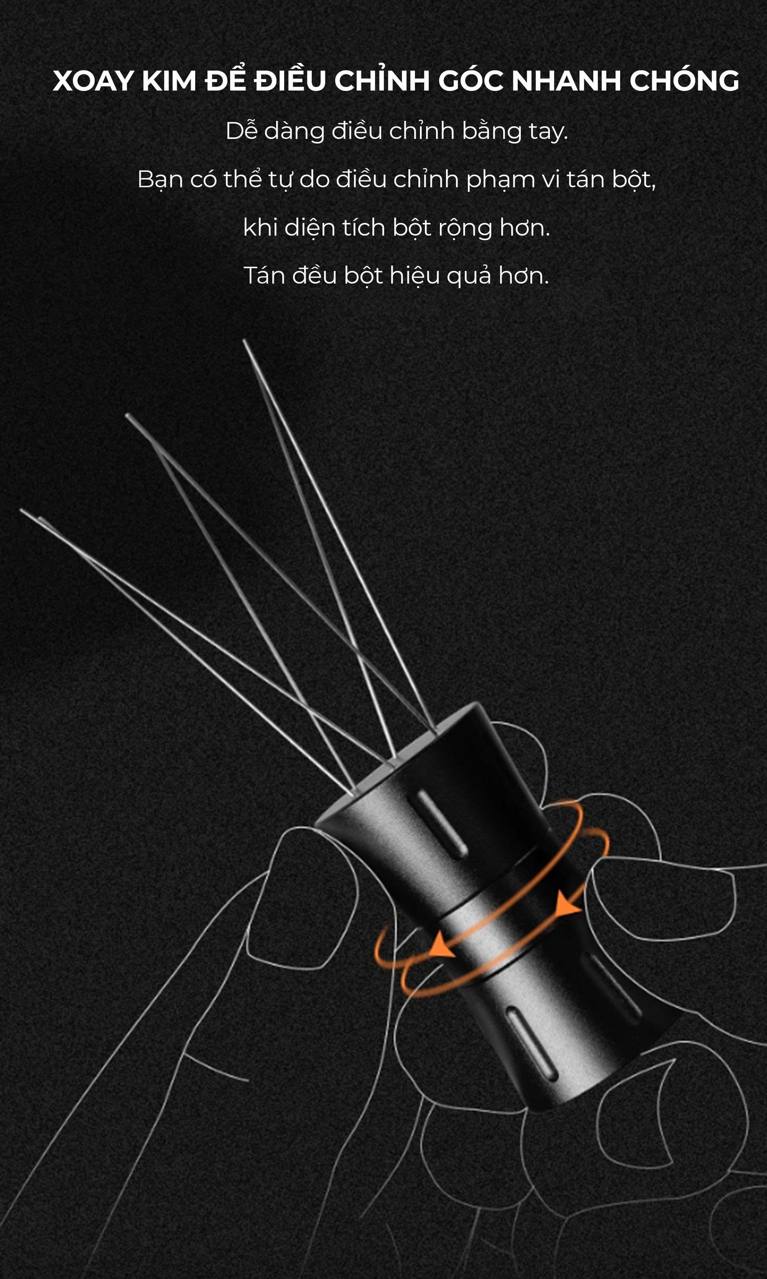 Sản phẩm được thiết kế dạng núm vặn bằng hợp kim nhôm sơn nhám. Cảm giác cầm rất chắc chắn và vừa tay. 8 thanh kim loại mỏng có độ dẻo và có thể uốn cong len lõi đánh tơi đến mọi nơi bên trong bánh cà phê. Khi bột được đánh tơi sẽ giúp phần tamping tốt hơn rất nhiều, áp suất nước sẽ chiết xuất đều hơn.