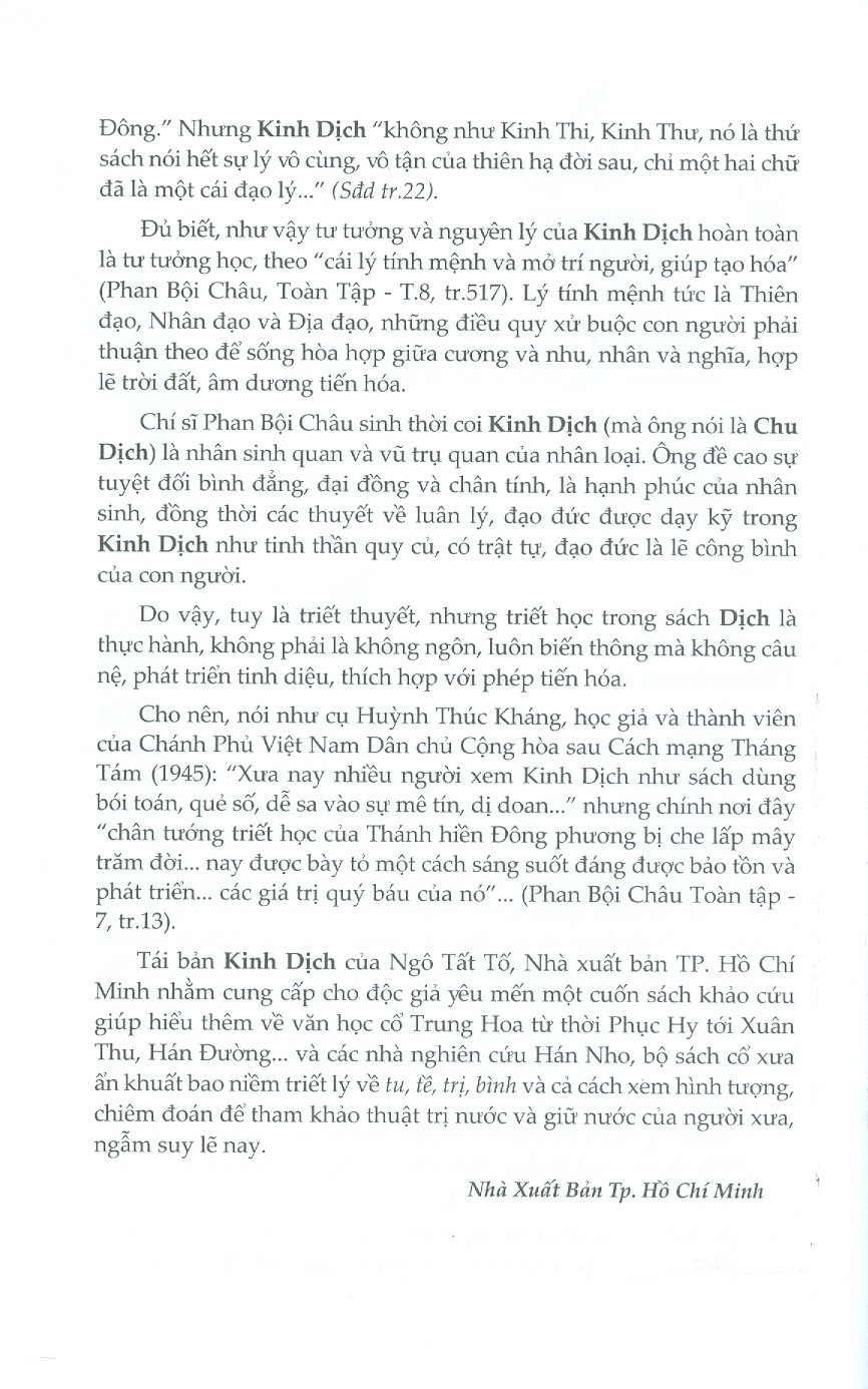 Kinh Dịch (Trọn Bộ) ------------ Trong lĩnh vực khảo cứu, dịch thuật, Ngô Tất Tố là người có những công trình nghiêm túc, như bộ Việt Nam văn học, các bộ Hoàng Lê nhất thống