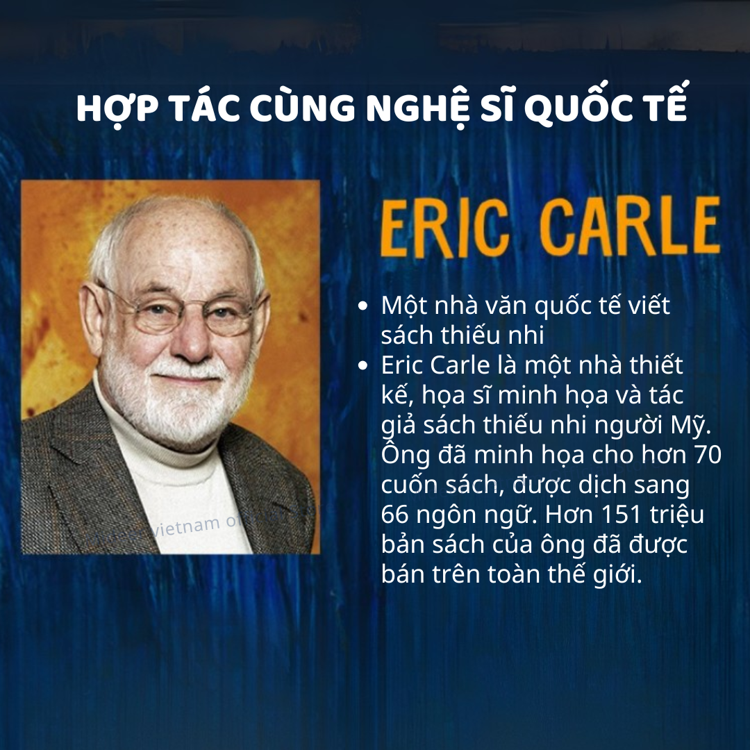 - HỢP TÁC CÙNG NGHỆ SĨ QUỐC TẾ- ERIC CARLE Một nhà văn quốc tế viết sách thiếu nhi Eric Carle là một nhà thiết kế, họa sĩ minh họa và tác giả sách thiếu nhi người Mỹ. Ông đã minh họa cho hơn 70 cuốn sách, được dịch sang 66 ngôn ngữ. Hơn 151 triệu bản sách của ông đã được bán trên toàn thế giới.