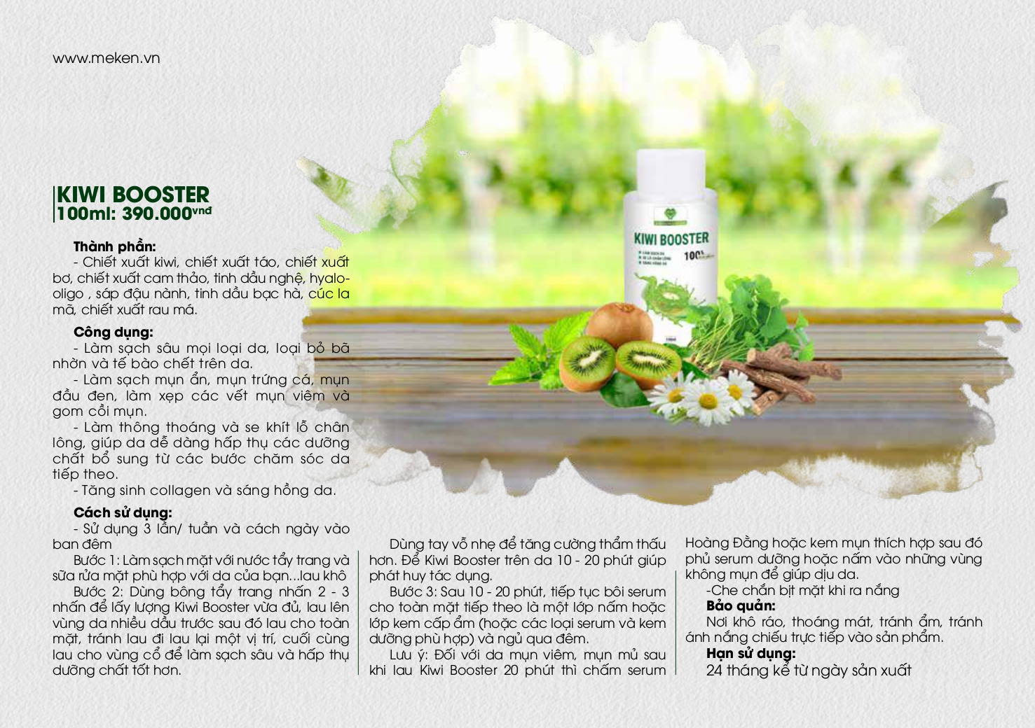 - Cách Sử Dụng : Sử dụng 2 - 3 lần/ tuần và cách ngày vào ban đêm. Bước 1: Làm sạch mặt với nước tẩy trang và sữa rửa mặt phù hợp với da của bạ lau khô. Bước 2: Dùng bông tẩy trang nhấn 2 - 3 nhấn để lấy lượng Kiwi Booster vừa đủ, rồi lau lên khắp mặt, lau vùng da dầu trước sau đó lau cho toàn mặt, tránh lau đi lau lại một vị trí, cuối cùng lau cho vùng cổ để làm sạch sâu và hấp thụ dưỡng chất tốt hơn. Dùng tay vỗ nhẹ để tăng cường thẩm thấu hơn. Để Kiwi Booster trên da 10 - 20 phút giúp phát huy tác dụng. Bước 3: Sau 10 - 20 phút bôi serum cho toàn mặt tiếp theo là một lớp nấm hoặc lớp kem cấp ẩm ( hoặc các loại serum và kem dưỡng phù hợp ) và ngủ qua đêm. Lưu ý : Đối với da mụn viêm, mụn mủ sau khi lau Kiwi Booster 20 phút thì chấm serum Hoàng Đằng hoặc kem mụn thích hợp, sau đó phủ serum dưỡng hoặc nấm vào những vùng không mụn để giúp dịu da. Che chắn bịt mặt khi ra nắng.