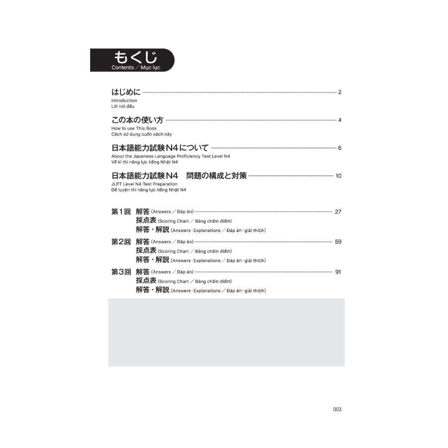 Bao gồm 3 đề luyện thi Kỳ thi năng lực Nhật ngữ cấp độ N4. Giải 3 bộ đề có hình thức hoàn toàn giống với kỳ thi thật, bạn đã trang bị cho mình nhiều kiến thức để thử thách trong kỳ thi chính thức.