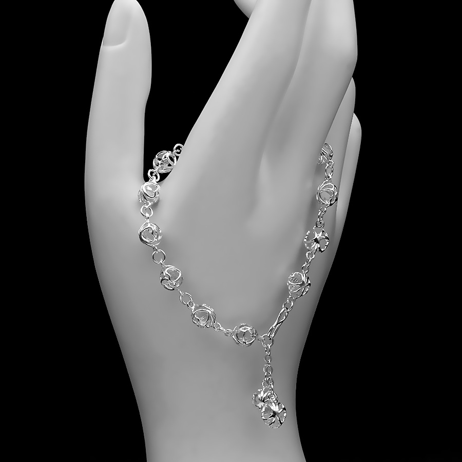 Là con gái, hẳn bạn luôn bị cuốn hút trước những bộ cánh thời trang và những đôi giày sành điệu. Tuy nhiên để làm hoàn hảo hình ảnh của mình trong mắt người đối diện, các bạn cần thêm những món phụ kiện bé bé xinh xinh để điểm tô cho vẻ ngoài thêm ấn tượng. Và hôm nay, S sẽ mang đến các bạn cơ hội sở hữu chiếc lắc tay rất dễ thương, được làm bằng bạc ta. Sản phẩm thích hợp với những bạn gái có phong cách dịu dàng, nữ tính.