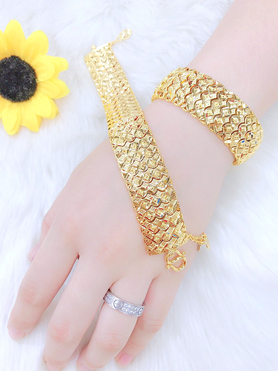 Cặp Lắc Tay Nữ Đẹp Vàng Tây gần 18k. Kiểu Mẫu Xích Hoa 4 Cánh Chạm Khắc phối Vòng Mắt Mèo #shorts