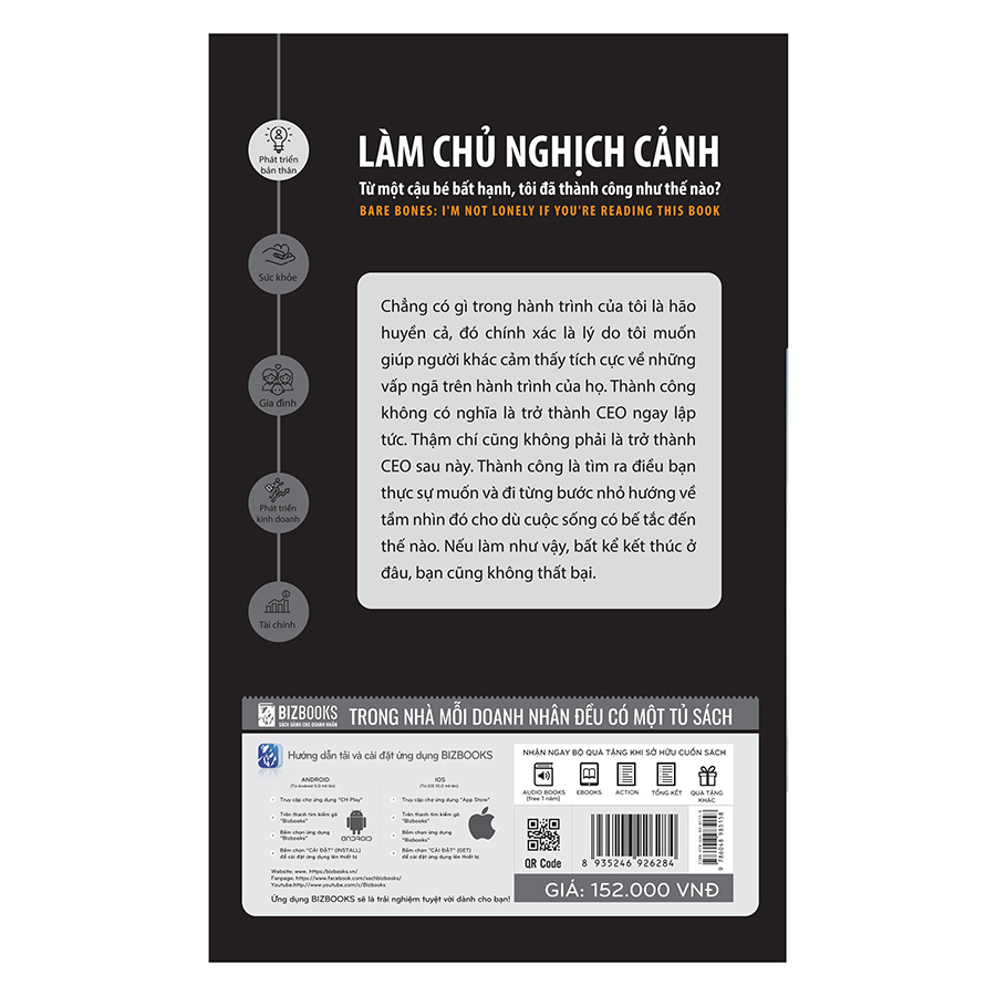 Làm chủ nghịch cảnh – Từ một cậu bé bất hạnh, tôi đã thành công như thế nào? Đời người chẳng tránh được nghịch cảnh trớ trêu Trong đời, lắm lúc bạn thực sự cảm thấy như có cầu vồng nở trong lòng, phấn chấn vô cùng, cũng có khi tâm ý ủ dột như một ngày mưa buồn rầu, xám xịt. Cuộc đời con người không tránh khỏi những nghịch cảnh, gập ghềnh, nhấp nhô trắc trở. Tuy vậy, khi ở đáy vực sâu cuộc đời thì điều đáng sợ không phải là những thách thức gian nan ấy, mà chính là sự yếu đuối và co ro sợ sệt của của bản thân mình. Mọi thứ giống như vòng quay, hết vui lại buồn, tâm trạng bạn cũng vì thế mà sớm nắng, chiều mưa. Gặp chuyện vui thì mừng, chuyện buồn thì chán, đó không phải điều lạ lùng gì. Quan trọng hơn cả là dù ở trong bất kỳ tình cảnh nào, bạn vẫn có thể giữ được sự an nhiên, tĩnh tại. Thành công và thất bại cũng chính ở điểm này. Khi chuyện vui đến, tâm trạng tốt, dĩ nhiên ai mà chẳng mừng? Lúc chuyện xấu ập tới, nếu có thể giữ vững được ý chí và thái độ tích cực thì mới là người làm được chuyện lớn. Người thành công nào cũng phải trải qua thất bại. Mỗi lần thất bại đều là để chúng ta tiến gần hơn tới ngưỡng cửa thành công. Một người thất bại không có gì đáng hổ thẹn, điều đáng hổ thẹn chính là không dám đối diện với thất bại, không dám gánh vác trách nhiệm, chỉ biết oán Trời trách người, oán trách vận mệnh không công bằng. Cuộc đời con người, có thể lấy lên được đặt xuống được, mới là người có tầm chân chính. Một mặt tiến lên, đạt được, một mặt lại không dám tiếp nhận thất bại, người như thế hoàn toàn không xứng đáng thành công. “Làm chủ nghịch cảnh” – hành trình vượt khó ngoạn mục của Bobby Bones “Làm chủ nghịch cảnh” là cuốn tự truyện đầy ly kỳ, hấp dẫn về quá trình Bobby Bones vươn tới thành công. Từ một nhân vật chẳng có chút tiếng tăm, chẳng có chút tiền tài nào trong tay, Bobby Bones đã nắm lấy những cơ hội hiếm có để vươn mình lên. Dù con đường anh đi không hề trải thảm hoa hồng nhưng không vì thế mà anh chùn bước. Để sinh tồn, Bobby đã vượt qua muôn vàn khó khăn, trau dồi bản thân, học cách ứng phó linh hoạt với mọi tình huống. Anh lớn lên là một đứa trẻ trong công viên, nơi những chiếc xe mooc đậu với những khoản phúc lợi xã hội cùng những chiếc tem phiếu thực phẩm. Anh đã quen với thiếu thốn, với nghiệt ngã. Nhưng hoàn cảnh đã rèn giũa anh, không cho phép anh mệt mỏi hay kiệt sức. Đến khi lớn lên và theo đuổi nghề phát thanh viên, anh cũng phải trải qua những buổi thử giọng, những thất bại trong nghề, chuyển đổi nơi làm việc. Trước những thất bại, khó khăn, Bobby Bones vẫn luôn duy trì tư tưởng tiến về phía trước, không cho phép bản thân thụt lùi về phía sau. Từ một đứa trẻ nghèo, người mẹ không có việc làm, người bố bỏ đi từ khi còn nhỏ, cuộc sống đầy rẫy mặc cảm, giờ đây anh lại có thể ở cùng một căn phòng với các nhà sản xuất lớn. Từ một người chân ướt chân ráo bước vào đài phát thanh, anh trở thành người dẫn chương trình nổi tiếng với mức thu nhập khổng lồ. Qua cuốn sách, tác giả nhắn nhủ rất nhiều điều ý nghĩa. Xuất phát điểm của bạn không có quyền quyết định cuộc sống sau này của bạn. Nhưng đôi khi trong tình huống ngặt nghèo nhất, bạn lại nhận được nhiều tình yêu thương nhất từ những người mà bạn không ngờ tới. Hãy học cách nắm lấy sai lầm của mình. Ngoài kia có nhiều người có tài nhưng tài năng đơn thuần không có nghĩa là chiến thắng. Hãy học về nghịch cảnh, học cách chúng ta xử lý như thế nào khi chúng ta phải đối mặt với nó. Những bài học rút ra từ cuốn sách Đừng cảm thấy buồn khi thành công chưa đến với bạn. Hãy tiếp tục nỗ lực và chăm chỉ hơn. Giúp đỡ người khác chính là giúp đỡ chính bạn. Nếu bạn đã từng nhận được sự giúp đỡ từ những người xung quanh, hãy cố gắng giúp đỡ những người khác khi có thể. Hãy suy nghĩ về những cái lợi của sự cho đi. Cách tốt nhất để giúp đỡ một ai đó là kết nối với người đấy. Dù cho là những người thành công trong cuộc sống, họ cũng chỉ giống như bất kỳ ai khác, có một khoảng thời gian khó khăn đi cùng với những nỗi thất vọng của cuộc đời. Nếu bạn đánh mất niềm tin ở người khác, bạn sẽ rất khó để có thể kết nối với mọi người. Vậy nên hãy tin tưởng nhiều hơn. Hãy trân trọng thời gian khi bạn thuộc về một ai đó hay một nơi nào đó. Để lạc quan hơn hay sống tốt hơn, hãy bao quanh mình với những người tích cực. Khi nghe thấy một tin tốt hoặc một điều gì đó tuyệt vời, bạn nên dành ra 30 giây và khiến nửa phút đó trở thành khoảnh khắc sống cho thực tại. Ban đầu, nó có vẻ kỳ quái và gượng ép. Nhưng sau đó một thời gian, nó trở nên dễ dàng hơn và b