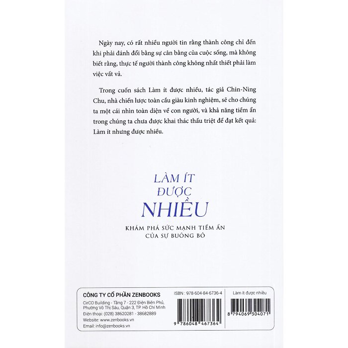 Mua tại TiktokNgày nay, có rất nhiều người tin rằng thành công chỉ đến khi phải đánh đổi bằng sự cân bằng của cuộc sống, mà không biết rằng, thực tế người thành công không nhất thiết phải làm việc vất vả. Trong cuốn sách “Làm ít được nhiều”, tác giả Chin-Ning Chu, nhà chiến lược toàn cầu giàu kinh nghiệm, sẽ cho chúng ta một cái nhìn toàn diện về con người, và khả năng tiềm ẩn trong chúng ta chưa được khai thác thấu triệt để đạt kết quả: Làm ít nhưng được nhiều.