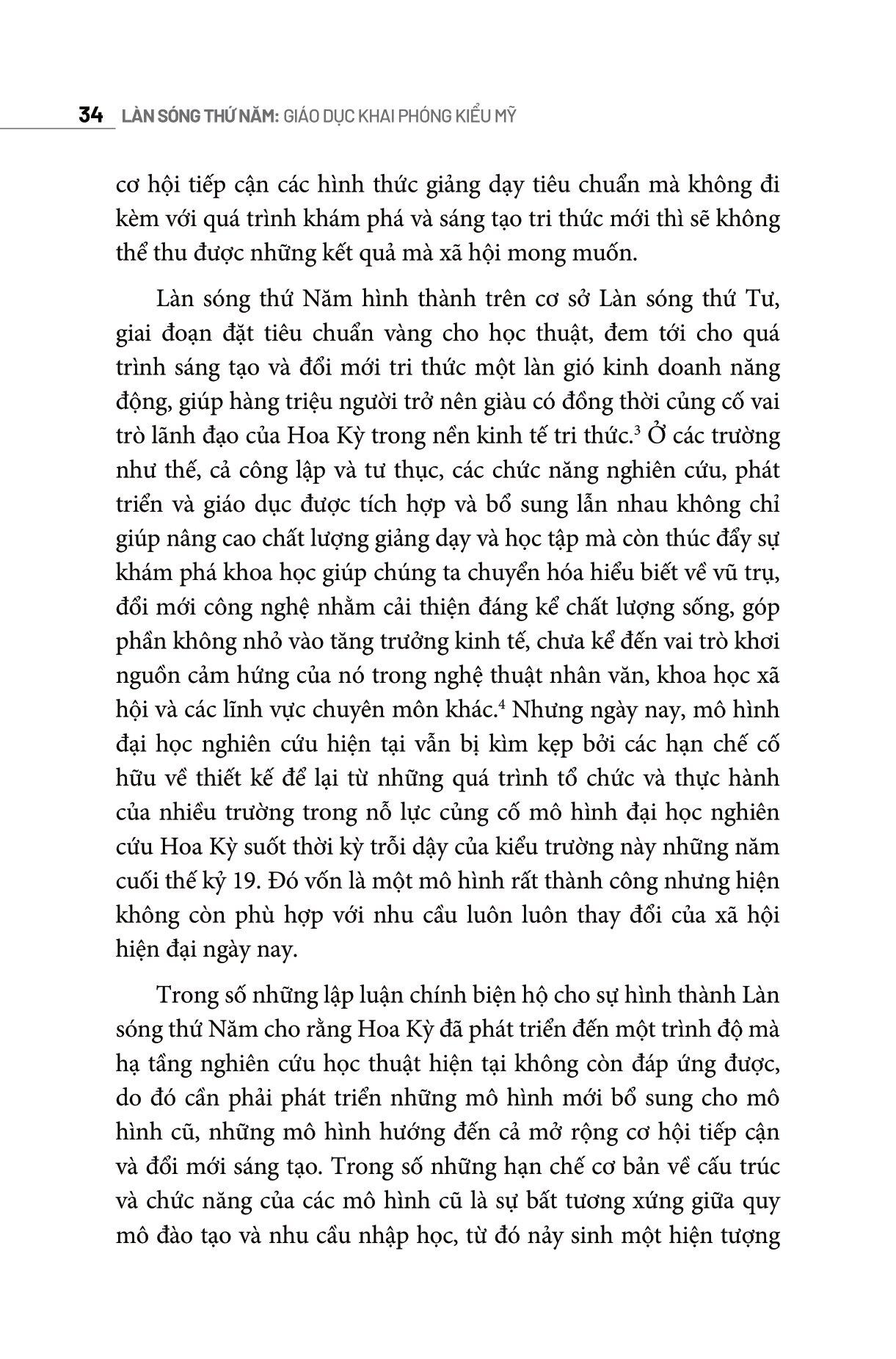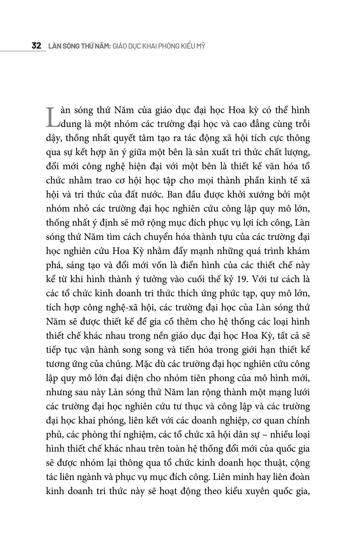 Làn Sóng Thứ Năm: Giáo Dục Khai Phóng Kiểu Mỹ Tái cấu trúc giáo dục đại học Hoa Kỳ Làn Sóng Thứ Năm: Giáo Dục Khai Phóng Kiểu Mỹ có thể được coi như một đề xuất tái cấu trúc giáo dục đại học Hoa Kỳ nói chung, dựa trên trường hợp thành công của Đại học Bang Arizona, và rộng hơn nữa là để tham khảo trong quá trình tái cấu trúc giáo dục đại học ở các nước trên thế giới, trong đó có Việt Nam, vốn đã có truyền thống hợp tác gần gũi, sâu rộng với ASU. Các tác giả của cuốn sách thực sự am hiểu sâu sắc về những gì nên và không nên làm trong giáo dục đại học: tận dụng mọi thế mạnh của sinh viên và hướng họ đến những vấn đề cấp bách nhất của thời đại. Trong The Fifth Wave: The Evolution of American Higher Education, Michael M. Crow và William B. Dabars lập luận rằng các trường cao đẳng và đại học cần được thiết kế lại toàn diện để có thể đào tạo càng nhiều sinh viên càng tốt và giữ nguyên chỉ tiêu tuyển sinh ngay cả khi thứ hạng của trường tăng lên (tức không tuyể sinh khắt khe hơn). Hai ông cho rằng chính sách tuyển sinh quá nghiêm ngặt của các trường như Harvard và Yale chỉ có nghĩa là họ đã chọn những sinh viên mà thành công sau này ít nhiều đã được bảo đảm, dù thế nào. Theo ông, việc đào tạo những sinh viên có khả năng và cơ hội thành công thấp hơn mới mang lại nhiều giá trị. Các nghiên cứu mới đây đã chứng minh ý kiến của ông là đúng. Làn Sóng Thứ Năm: Giáo Dục Khai Phóng Kiểu Mỹ - Làn sóng của tri thức và công nghệ Về mặt tên gọi, Crow và Dabars phân chia lịch sử giáo dục đại học Hoa Kỳ thành các làn sóng nối tiếp nhau từ các trường thời lập quốc (Làn sóng thứ Nhất) cho đến các trường đại học nghiên cứu (Làn sóng thứ Tư), và Làn sóng thứ Năm đang dần hình thành sẽ bao gồm một liên minh các trường cao đẳng và đại học có mong muốn mang lại tác động tích cực cho xã hội thông qua sự tích hợp liền mạch giữa sản xuất tri thức đẳng cấp thế giới và đổi mới công nghệ. Các trường thuộc Làn sóng thứ Năm như Đại học Bang Arizona đã bắt đầu mở rộng mạng lưới bao gồm học viện, doanh nghiệp, các cơ quan chính phủ, phòng thí nghiệm và các tổ chức xã hội dân sự. Tập hợp các thiết chế này ưu tiên tiếp cận nhóm nhân khẩu học rộng nhất có thể, đại diện cho các thành phần kinh tế xã hội và trí tuệ đa dạng trong xã hội. Ý tưởng về Làn sóng thứ Năm thực sự rất tuyệt vời. Với các dữ liệu phong phú và sự thật thú vị về các trường đại học, được đúc kết từ nhiều lĩnh vực khác nhau từ thiết kế, kinh tế, chính sách công, lý thuyết tổ chức, nghiên cứu khoa học và công nghệ, xã hội học, tâm lý học và thậm chí nhận thức luận, các tác giả đã trình bày một chủ đề quan trọng, đầy hứa hẹn và tôi tin rằng với bất kỳ ai quan tâm đến tương lai của giáo dục đại học đều không nên bỏ qua Làn sóng thứ Năm: Giáo Dục Khai Phóng Kiểu Mỹ.