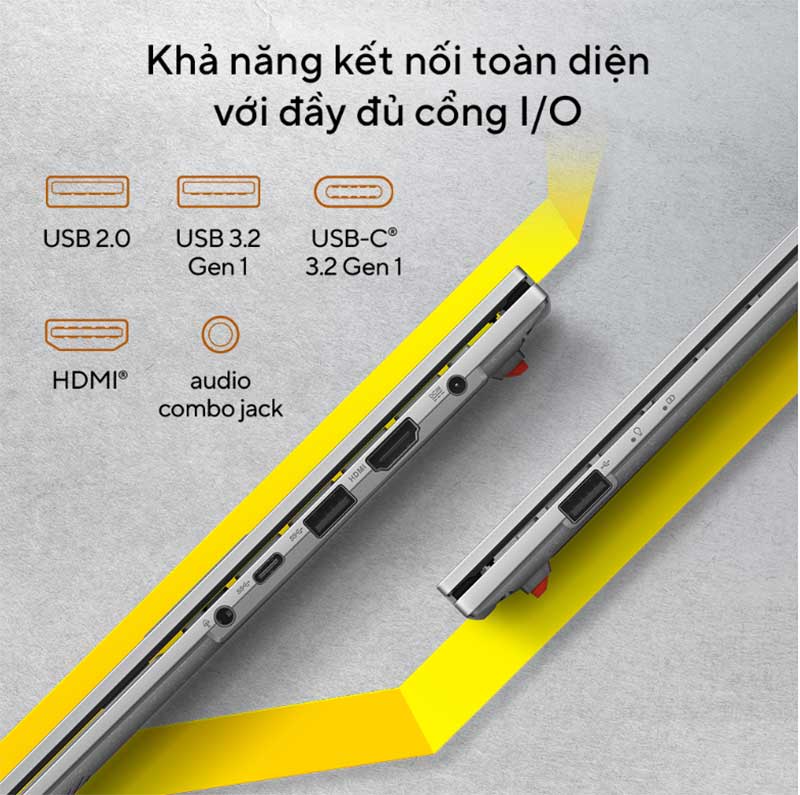 Ngoài kết nối mạng thì cũng cần phải chỉ tới các cổng I/O, hai cổng USB trong đó có một cổng USB 2.0 và một cổng USB 3.2 Type A; cộng thêm một cổng USB 3.2 Type C tốc độ trao đổi sao chép dữ liệu cực nhanh; thêm một cổng HDMI để chia sẻ nội dung ra màn hình lớn tiện lợi và một jack cắm tai nghe combo chuyên dụng để nghe nhạc bằng tai nghe trong hoặc loa ngoài đều được.