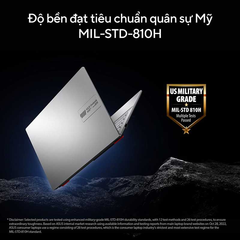 Để chiếc laptop Asus Vivobook Go 14 E1404FA-NK177W đến tay người dùng được bền bỉ và an toàn thì toàn bộ các linh kiện và lớp vỏ máy đều được trải qua những thử nghiệm khắt khe về tiêu chuẩn độ bền quân đội Mỹ MIL-STD-810H về độ rung lắc, nhiệt độ cao/ thấp, va chạm ngoài ý muốn mỗi khi di chuyển…Tổng cộng là trải qua 12 phương pháp kiểm tra nghiêm ngặt và 26 quy trình thử nghiệm khắc nghiệt và toàn bộ đều vượt xa kết quả mong đợi.