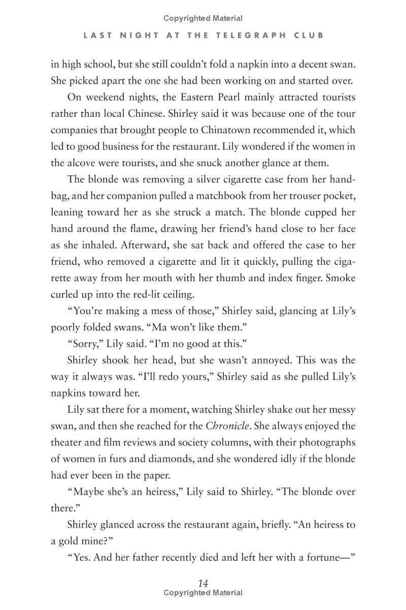 Seventeen-year-old Lily Hu can't remember exactly when the feeling took root—that desire to look, to move closer, to touch. Whenever it started growing, it definitely bloomed the moment she and Kathleen Miller walked under the flashing neon sign of a lesbian bar called the Telegraph Club. Suddenly everything seemed possible.
