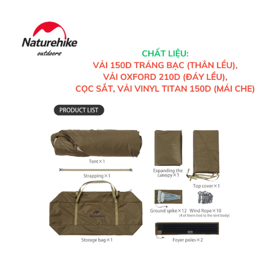- THÔNG TIN SẢN PHẨM - Thương hiệu: NatureHike - Mã sản phẩm: CNK2300ZP022 - Chất liệu: Vải Oxford 150D phủ Titanium, vải oxford 68D + vải oxford 210D + lưới nylon - Kích thước trong lều: 240210155cm - Kích thước ngoài lều: 477240160cm - Kích thước gấp gọn: 95*φ22cm - Trọng lượng: 10,8kg (có phụ kiện và túi đựng) - Chỉ số chống nước lớp ngoài lều: 2000-3000 mm - Chỉ số chống nước đáy lều: 2000-3000 mm - Phù hợp: 2-4 người - Màu sắc: Nâu - Xuất xứ: Trung Quốc