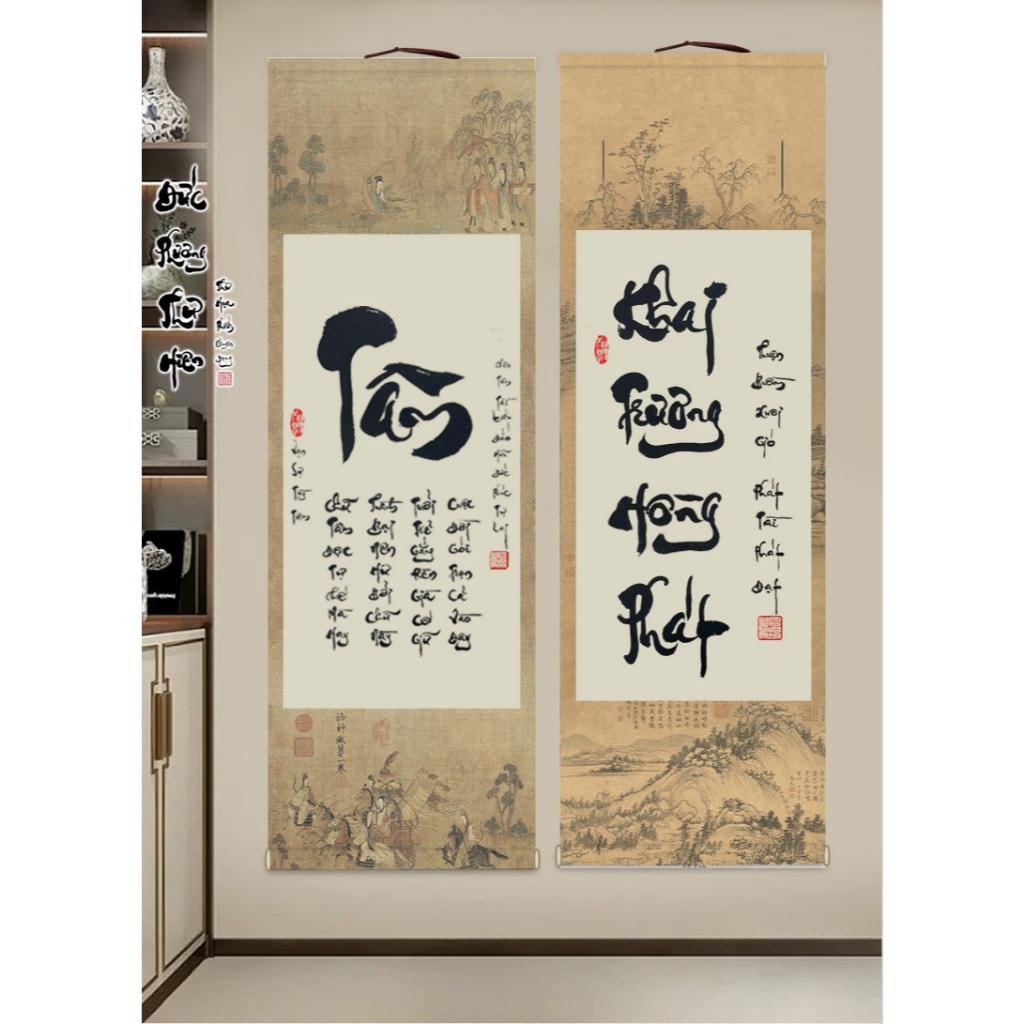 ✨Liễn bồi trục viết thư pháp cổ phong sơn thuỷ in viền tranh thuỷ mặc đặc sắc, thẩm mỹ