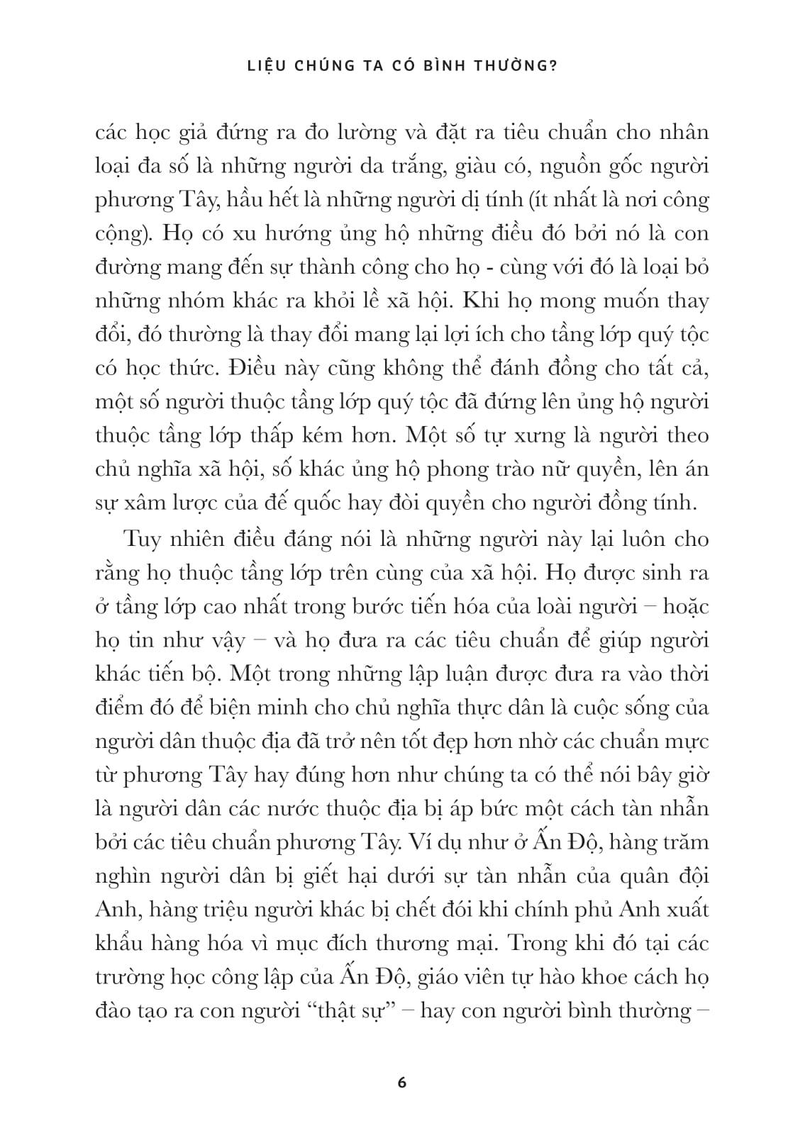 Thú vị và hoàn toàn thuyết phục, dẫn dắt vấn đề qua nhiều nguồn dẫn chứng, các công trình khoa học, các tác phẩm văn học, xã hội học... cuốn sách này sẽ giúp bạn đọc phần nào giải quyết được mối băn khoăn muôn thuở “Liệu chúng ta có bình thường?".
