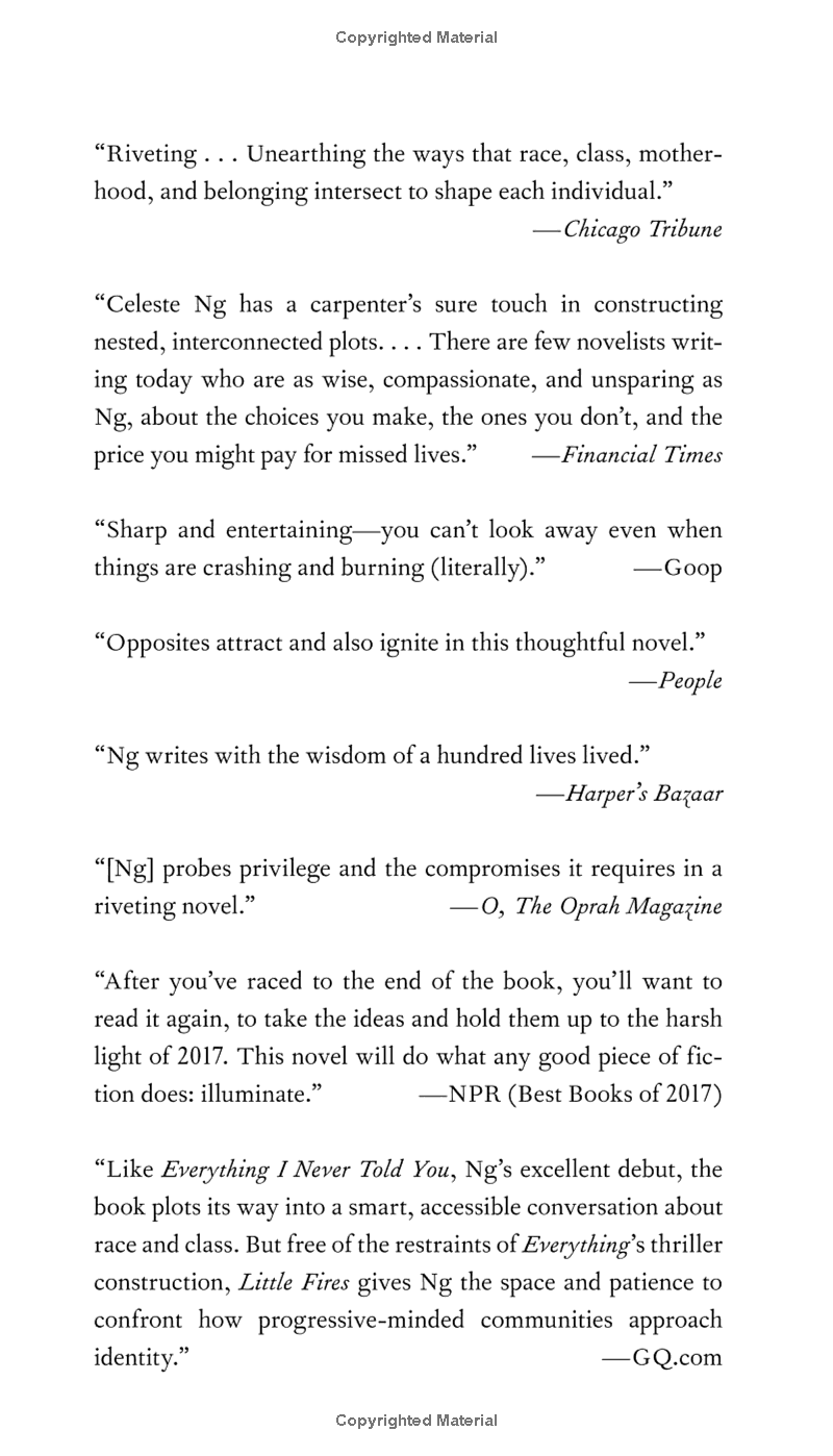 Enter Mia Warren—an enigmatic artist and single mother—who arrives in this idyllic bubble with her teenaged daughter Pearl, and rents a house from the Richardsons. Soon Mia and Pearl become more than tenants: all four Richardson children are drawn to the mother-daughter pair. But Mia carries with her a mysterious past and a disregard for the status quo that threatens to upend this carefully ordered community.