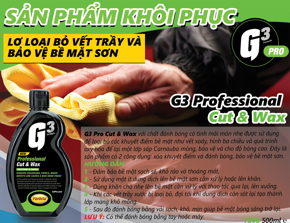 Mua tại TiktokG3 Pro Cut & Wax với chất đánh bóng có tính mài mòn nhẹ được sử dụng để loại bỏ các khuyết điểm bề mặt như vết xoáy, hình ba chiều và quá trình oxy hóa để lại một lớp sáp Carnauba mỏng, bảo vệ và cho độ bóng cao. Đây là sản phẩm có 2 công dụng: xóa khuyết điểm và đánh bóng, bảo vệ bề mặt sơn. HƯỚNG DẪN 1 - Đảm bảo bề mặt sạch sẽ, khô ráo và thoáng mát. 2 - Sử dụng một ít dung dịch lên bề mặt sơn cần xử lý hoặc lên khăn. 3 - Dùng khăn chà nhẹ lên bề mặt cần xử lý với thao tác qua lại, lên xuống. 4 - Khi các vết trầy xước bị loại bỏ, đợi tới khi dung dịch còn sót lại tạo thành lớp màng khô mỏng. 5 - Sau đó đánh bóng bằng vải sạch, khô, mịn giúp bề mặt bóng sáng trở lại. LƯU Ý: Có thể đánh bóng bằng tay hoặc máy.