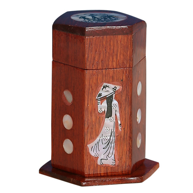 Thông tin sản phẩm Thiết kế tinh tế theo phong cách đồ gỗ mỹ nghệ khảm trai. - Ống đựng tăm có thể đóng mở, tiện lợi khi sử dụng. - Chất liệu gỗ bền