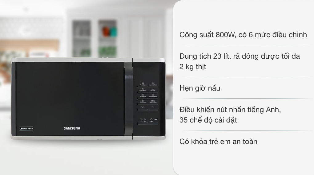 Thông số kỹ thuật chính Thương hiệu :Samsung Model: MS23K3513AS Màu Bạc Chiều cao (mm) 275 mm Chiều rộng (mm) 489 mm Độ sâu (mm) 374 mm Loại lò vi sóng Tự do Khối lượng